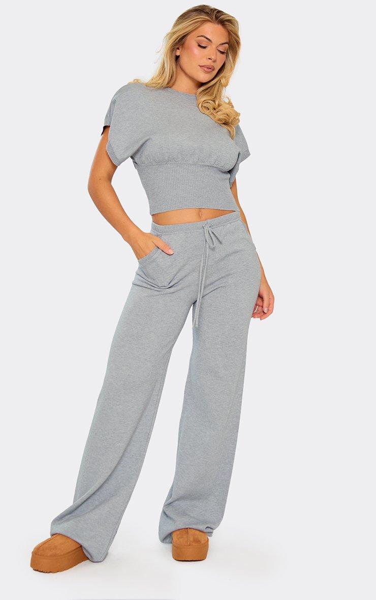 Crew Neck Short Sleeve Cinched Waist Top In Grey Knit
