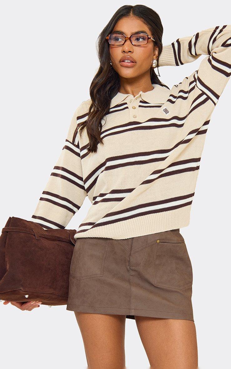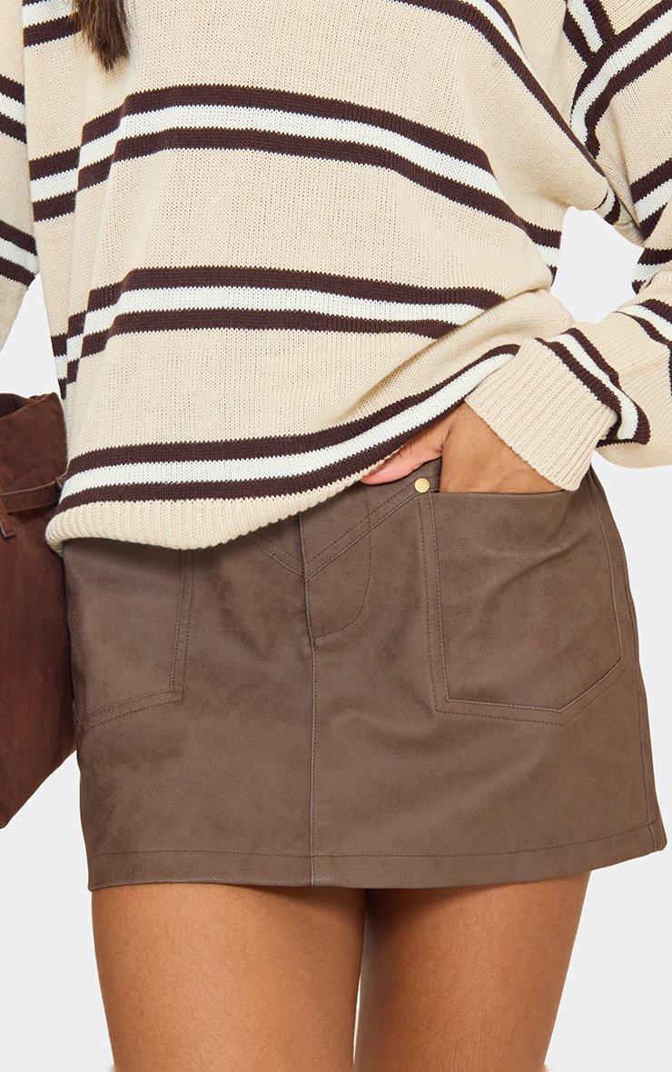mid rise pocket detail mini skirt in chocolate brown faux leather coated