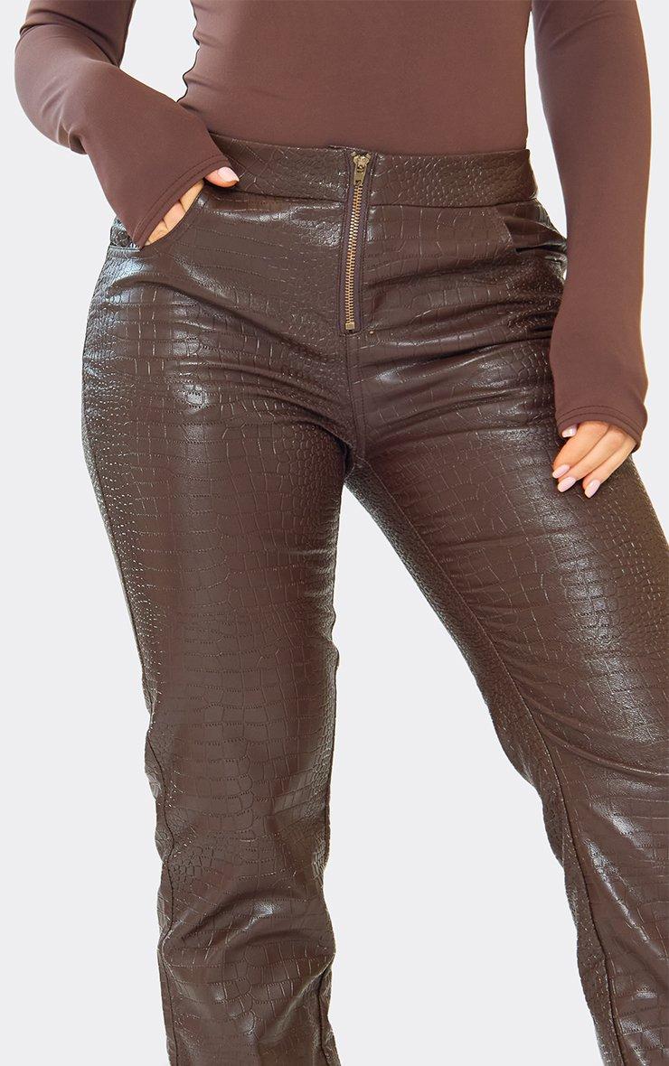 mid rise straight leg trousers in chocolate brown croc print faux leather