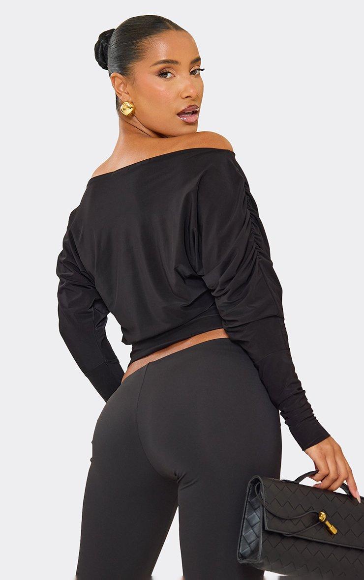 Slash Neck Off The Shoulder Cinched Waist Ruched T-Shirt In Black