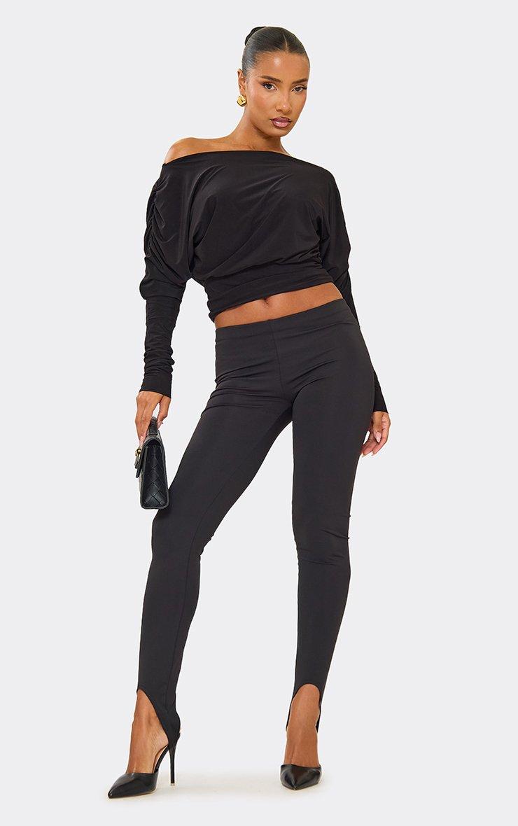 Long Sleeve Asymmetric Slash Neck Top In Black Slinky
