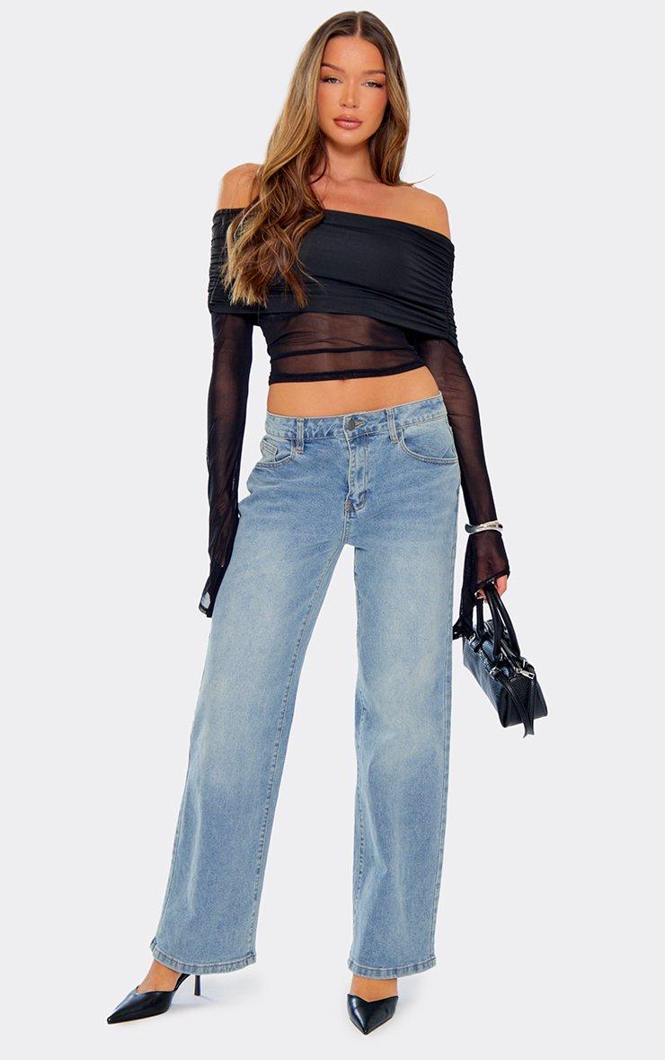 Bardot Flared Long Sleeve Ruched Detail Top In Black Mesh