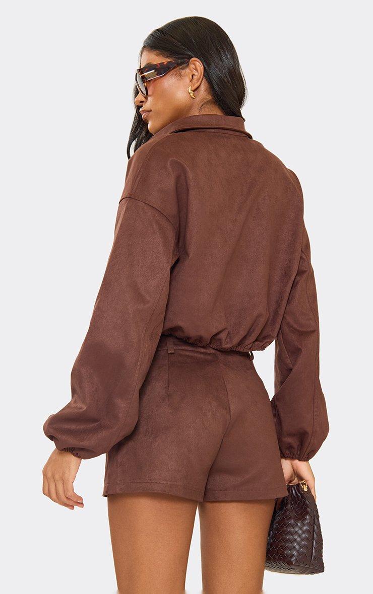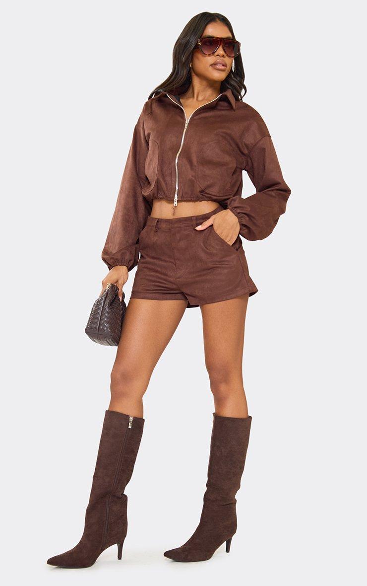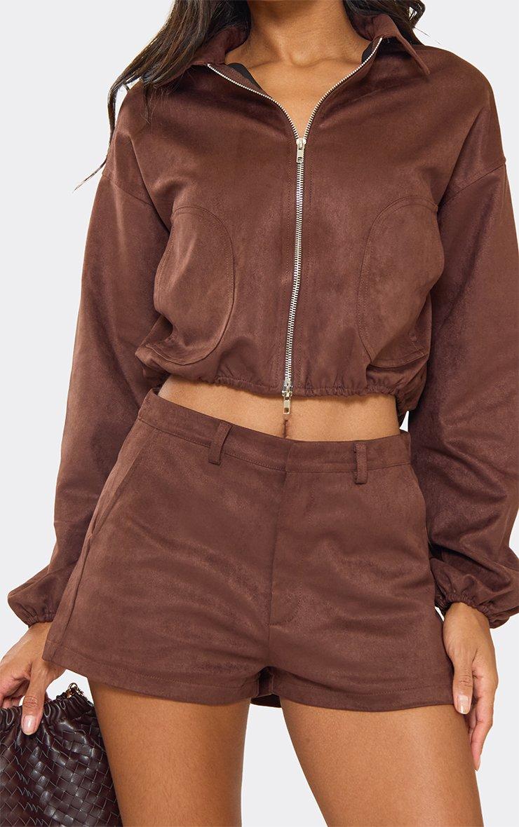 Mid Rise Tailored Shorts In Brown Faux Suede