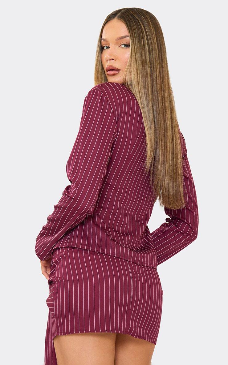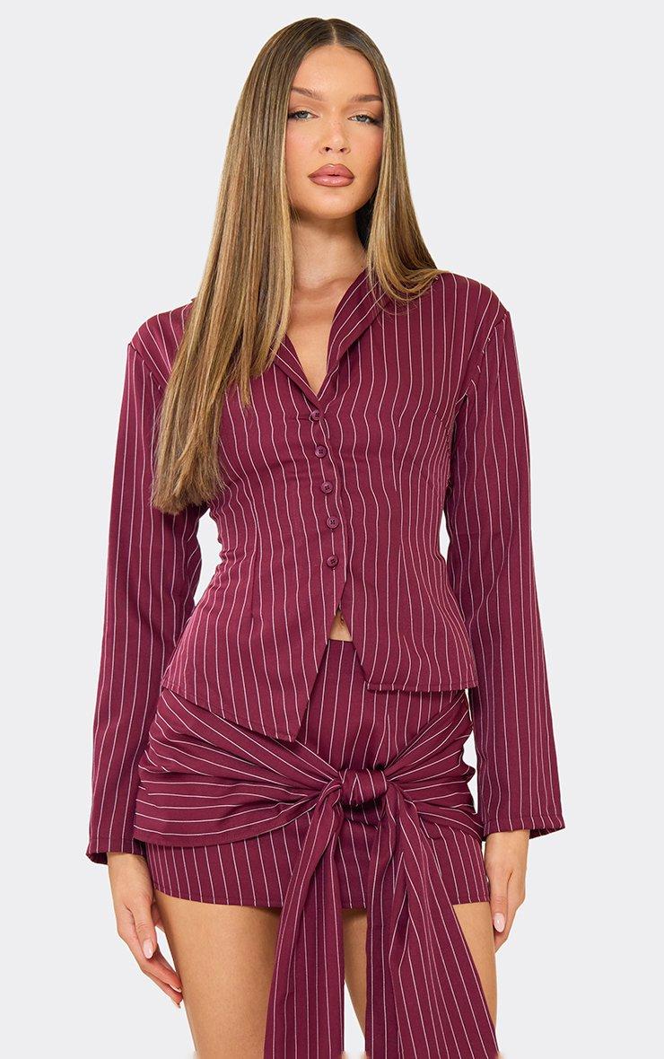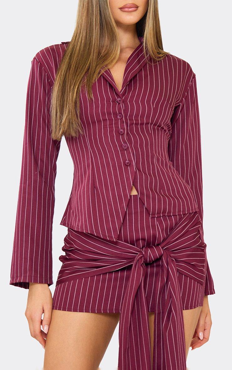 Long Sleeve Asymmetric Hem Shirt In Burgundy Pinstripe