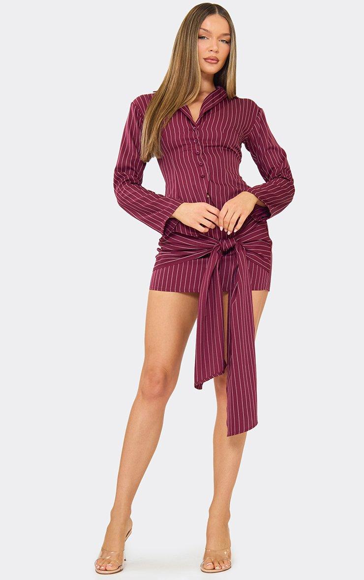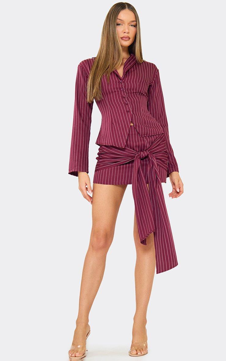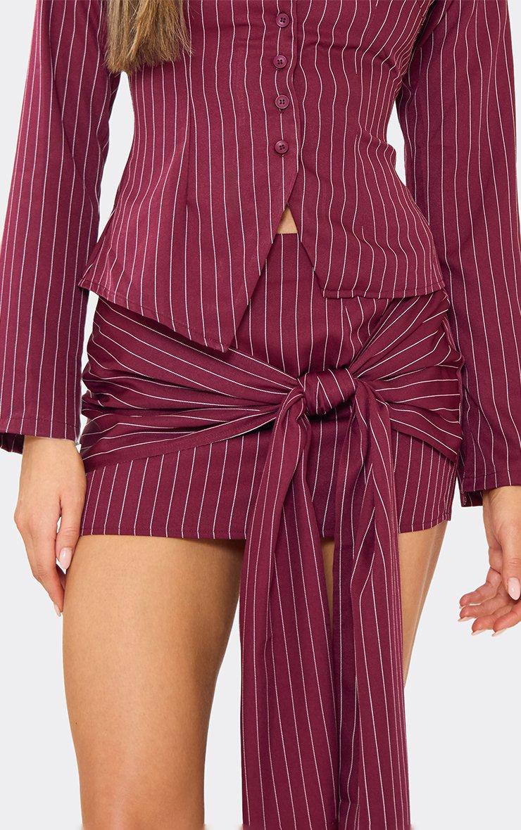 V Waist Drape Tie Front Mini Skirt In Burgundy Satin