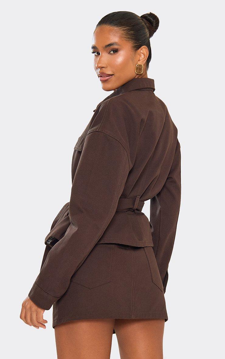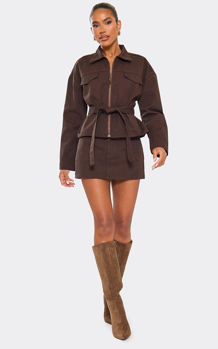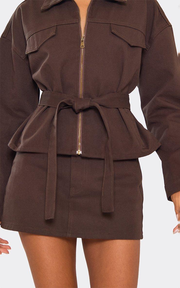 Tie Cinched Waist Zip Down Jacket In Chocolate Brown Denim