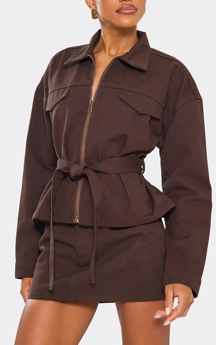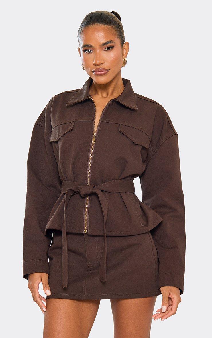 tie cinched waist zip down jacket in chocolate brown denim
