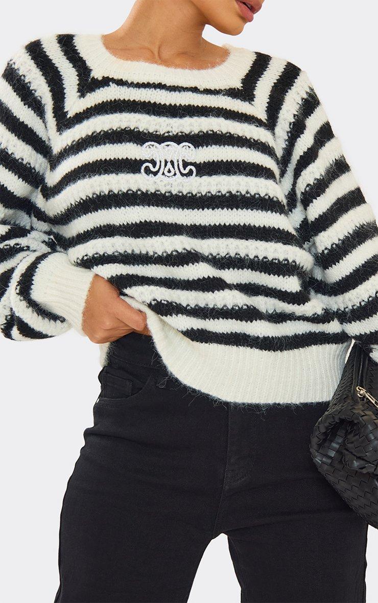 Long Sleeve Logo Detail Jumper In Stone Stripe Fluffy Knit