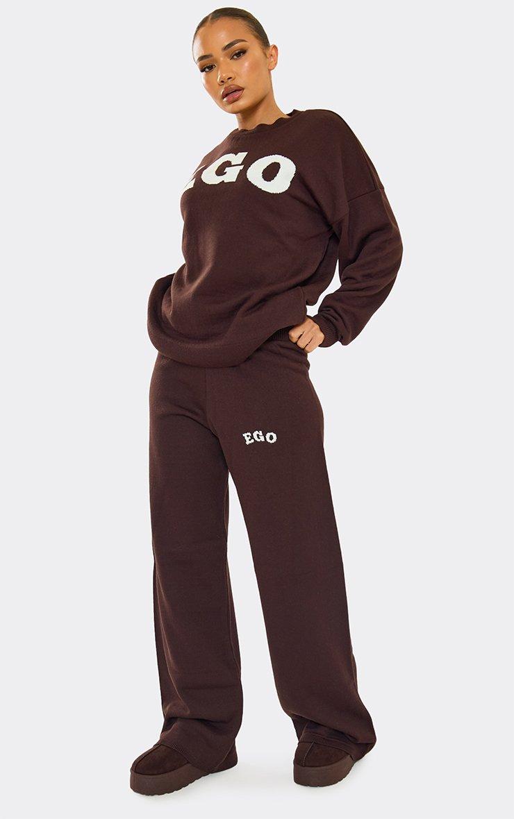 Mid Rise Ego Graphic Wide Leg Trousers In Chocolate Brown Knit