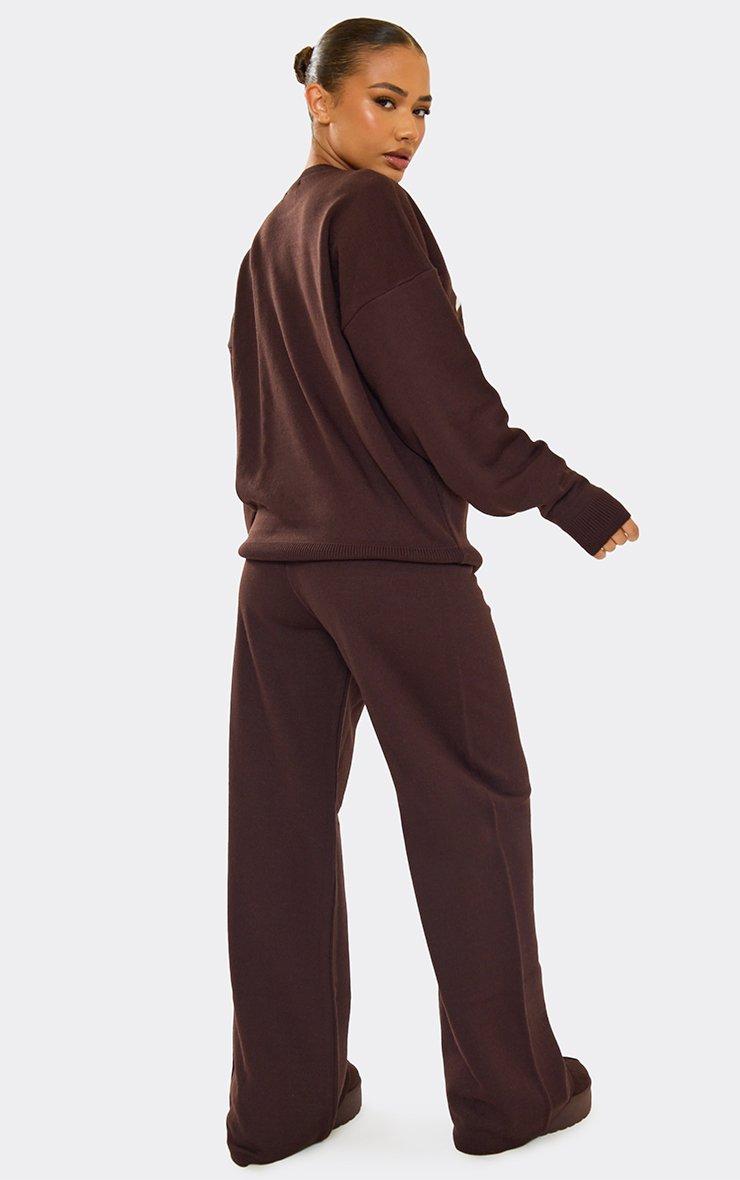 Mid Rise Fluffy Essential Logo Detail Wide Leg Trousers In Chocolate Brown Knit