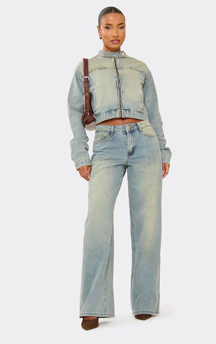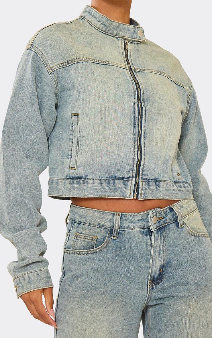 Long Cuffed Sleeve Zip Up Front Cropped Jacket In Blue Denim