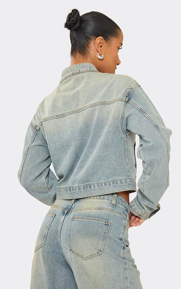 Long Sleeve Button Pocket Detail Cropped Jacket In Blue Wash Denim
