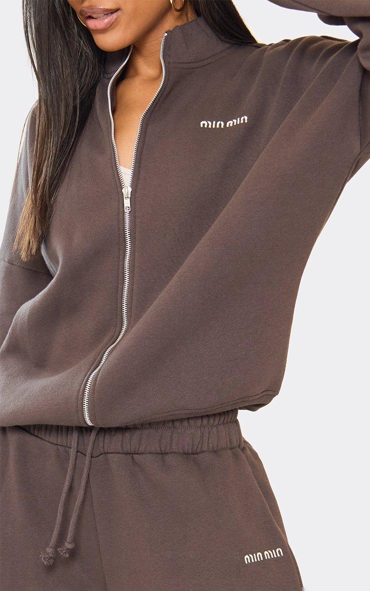Long Sleeve Min Min Embroidered Graphic Detail Zip Up Jacket In Chocolate Brown