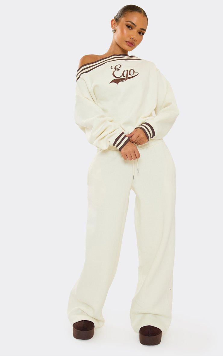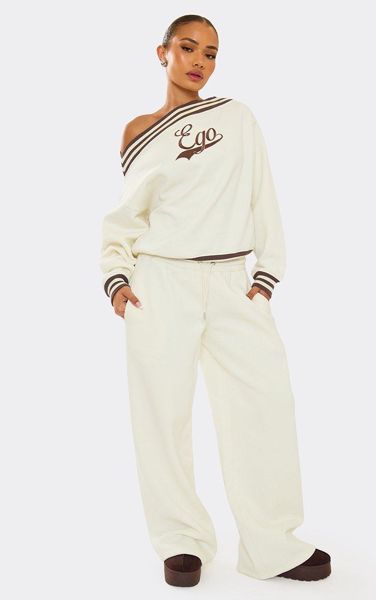High Waist Contrast Print Detail Wide Leg Joggers In Cream