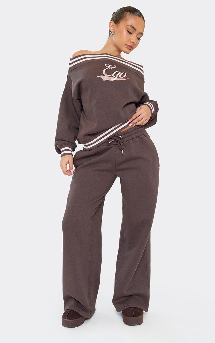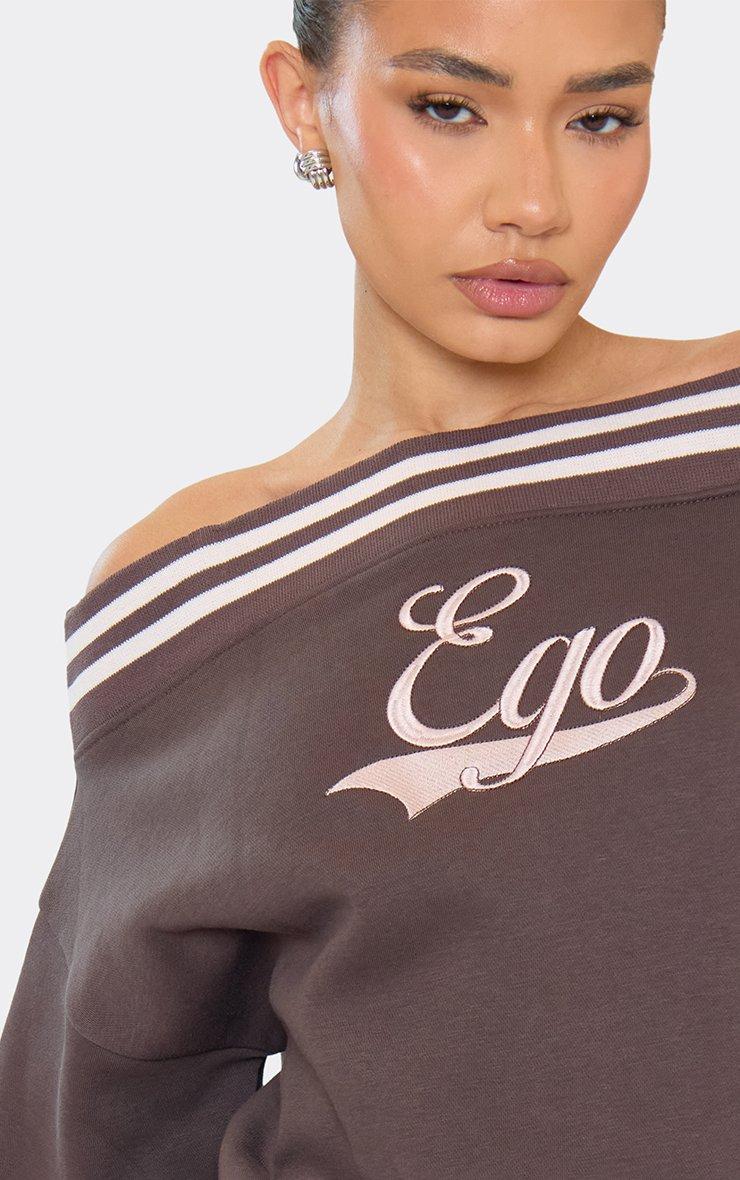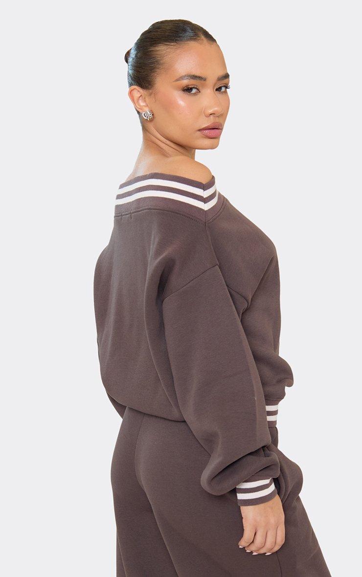 Oversized Off The Shoulder Contrast Stripe Embroidered Graphic Sweater In Chocolate Brown