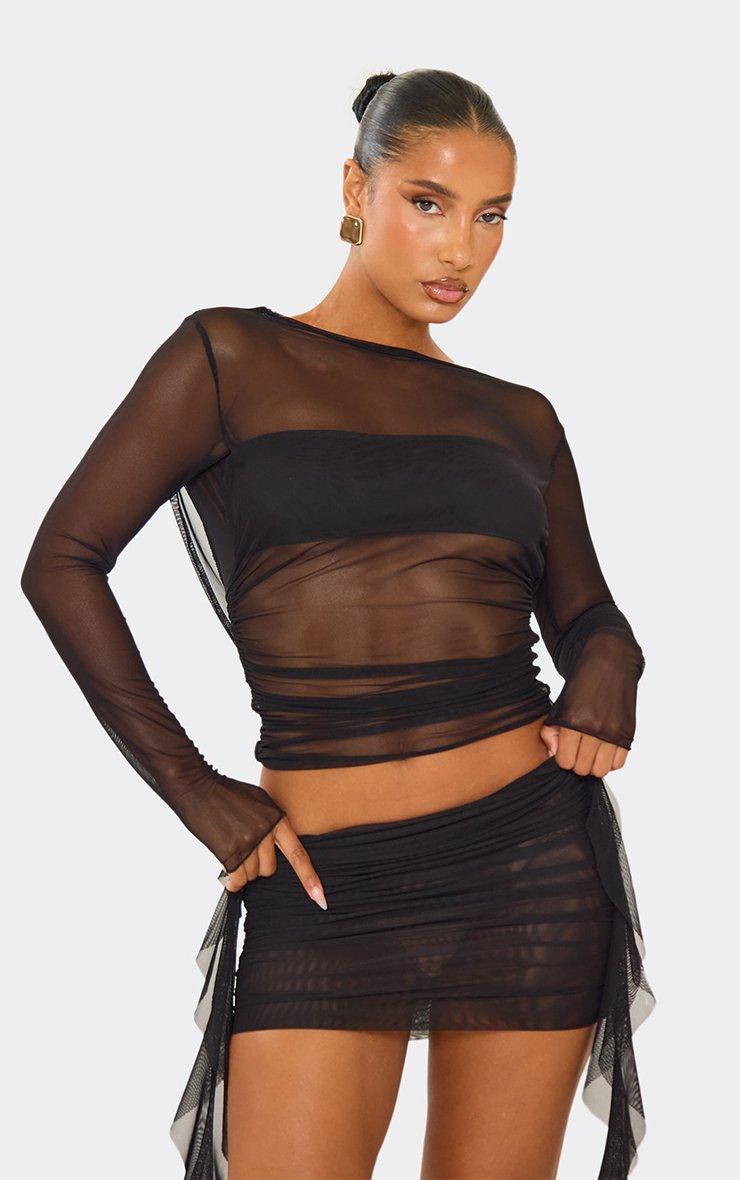 Long Sleeve Cowl Back Top In Black Mesh