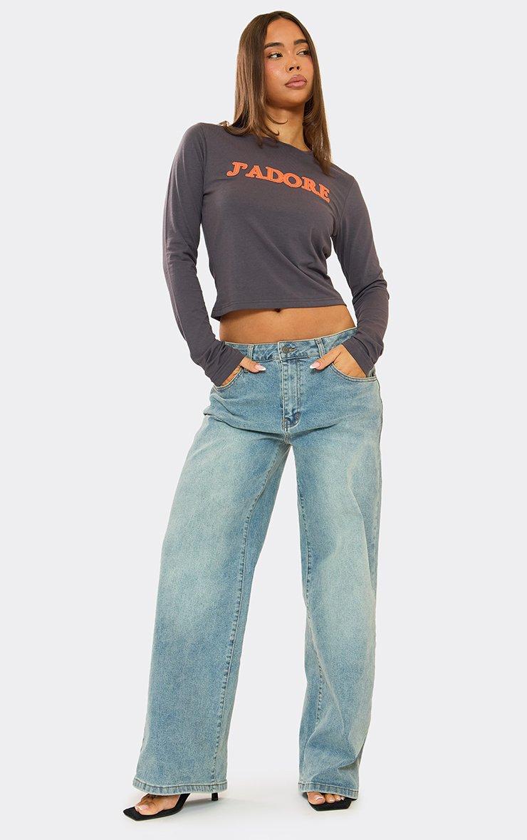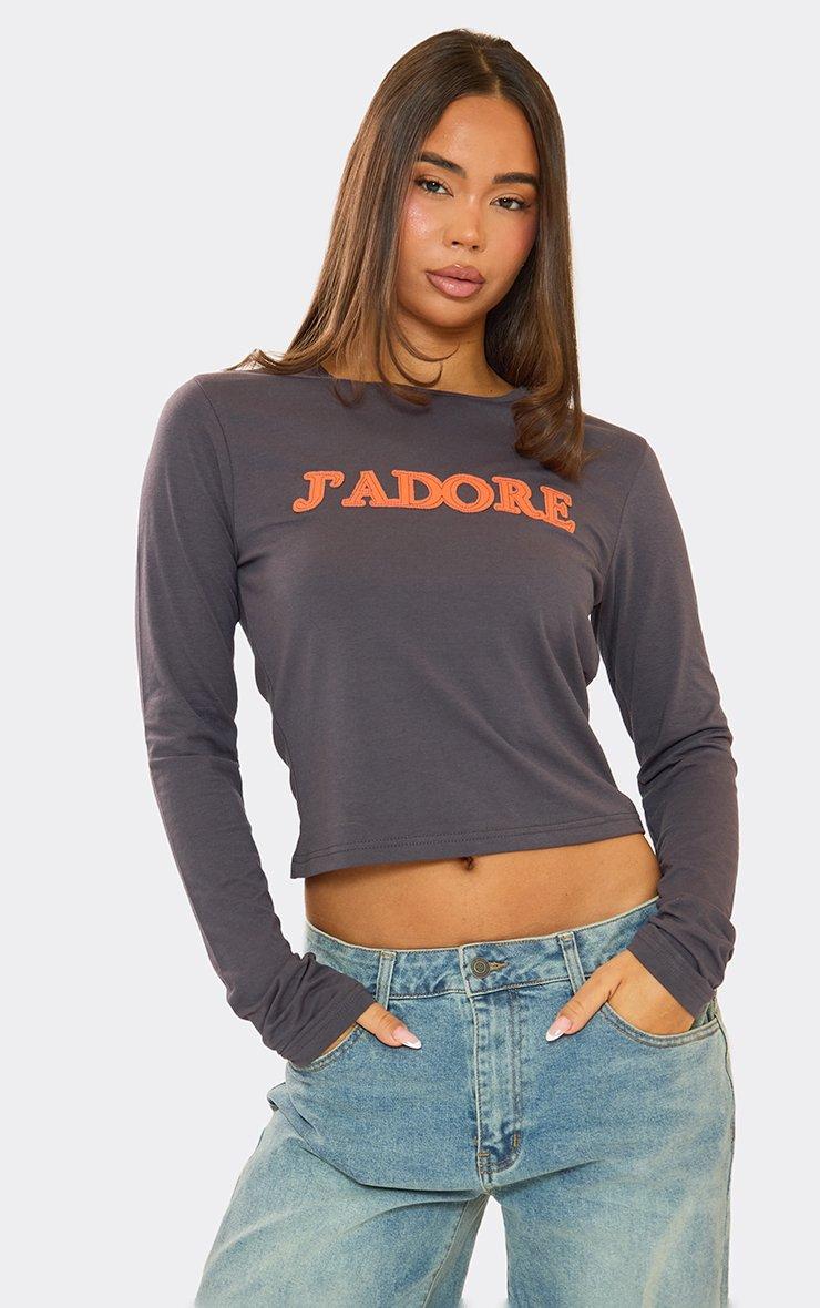 Long Sleeve Contrast Slogan Print Tank Top In Charcoal
