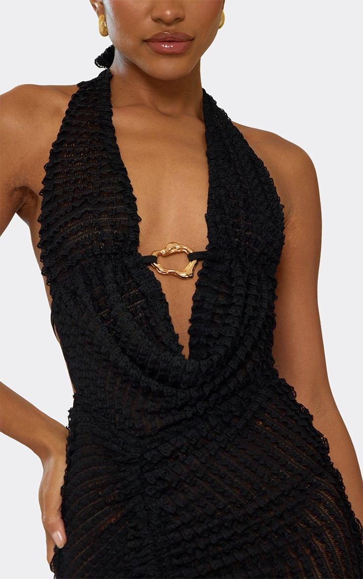 Cowl Neck Ring Trim Detail Ruched Mini Dress In Black Textured