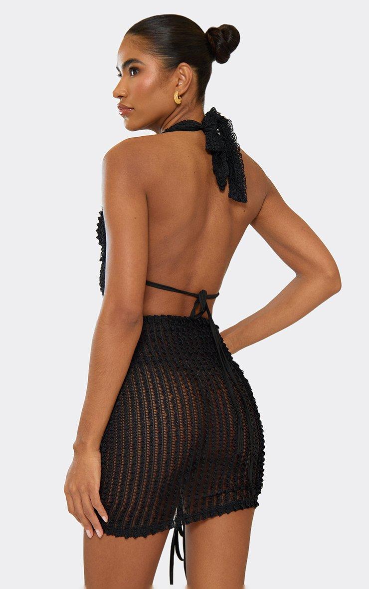 cowl neck ring trim detail ruched mini dress in black textured