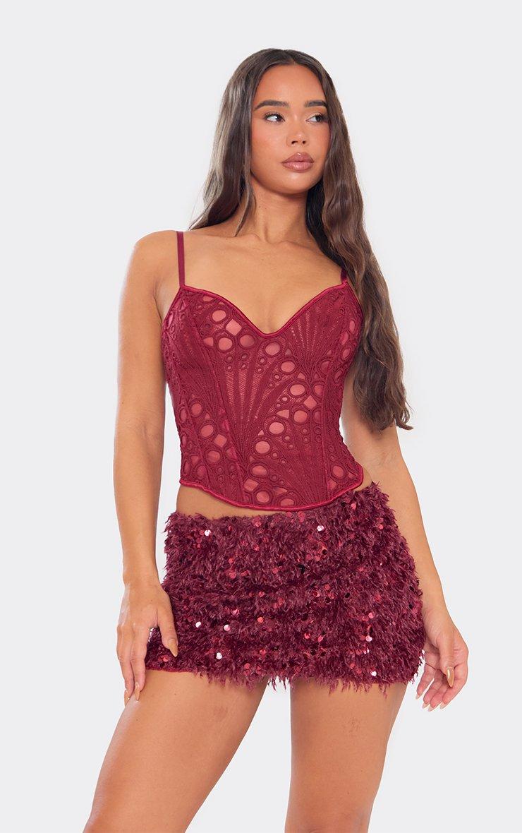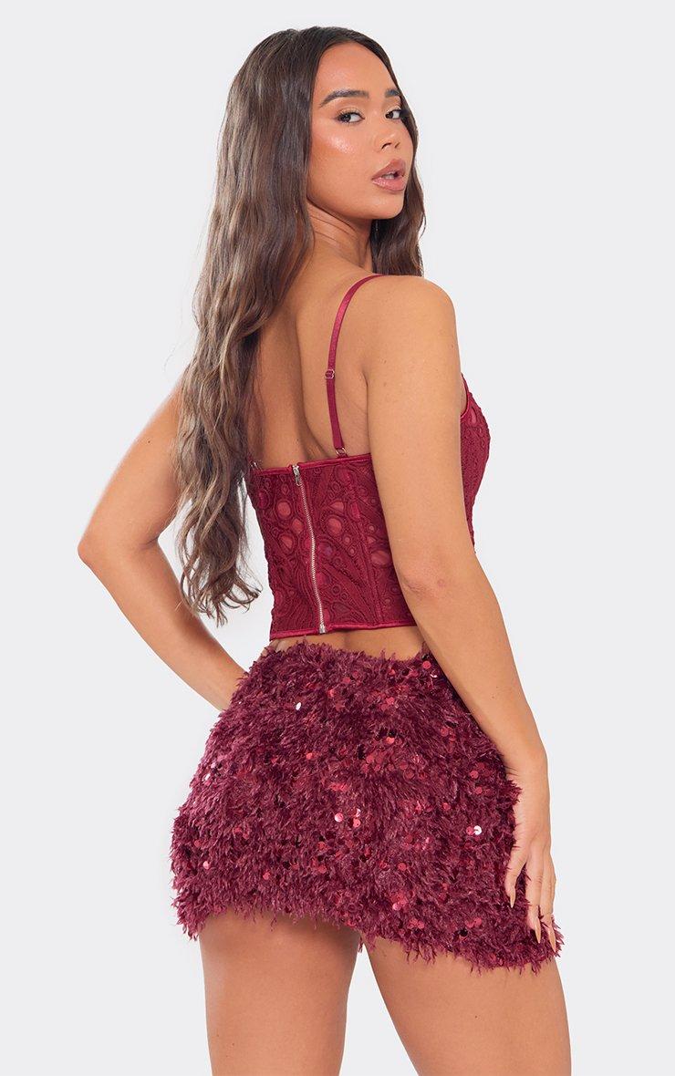 Mid Rise Mini Skirt In Burgundy Textured Sequin