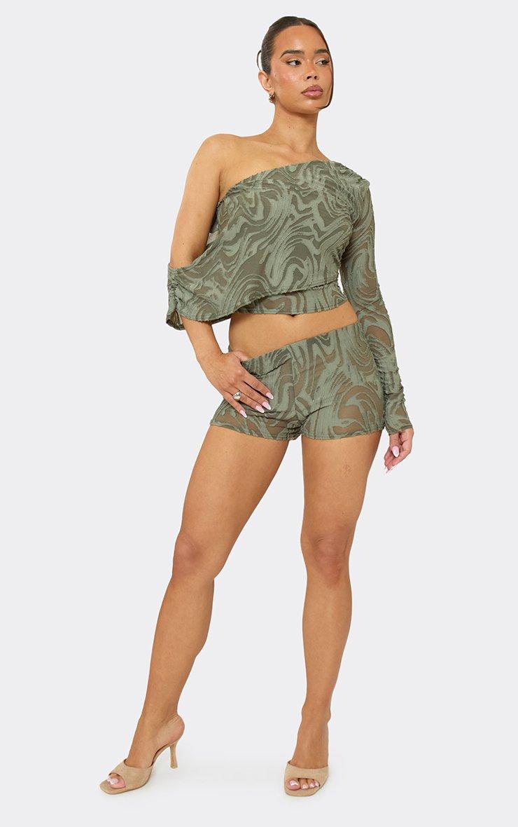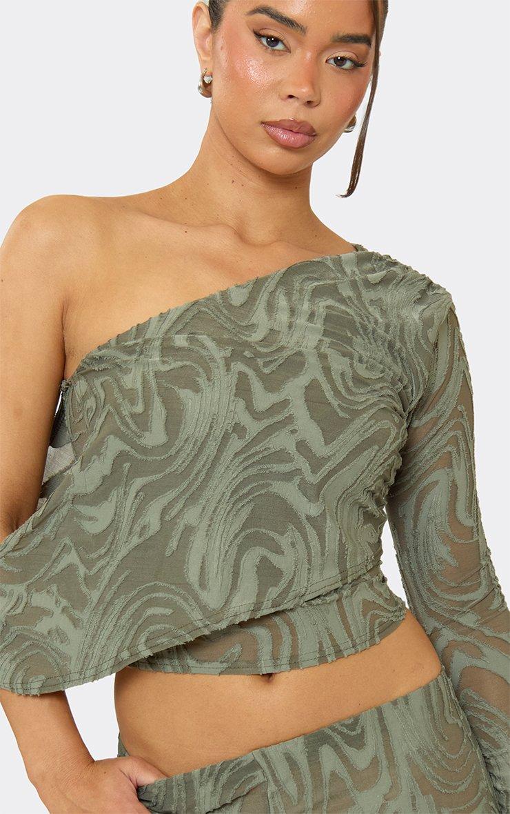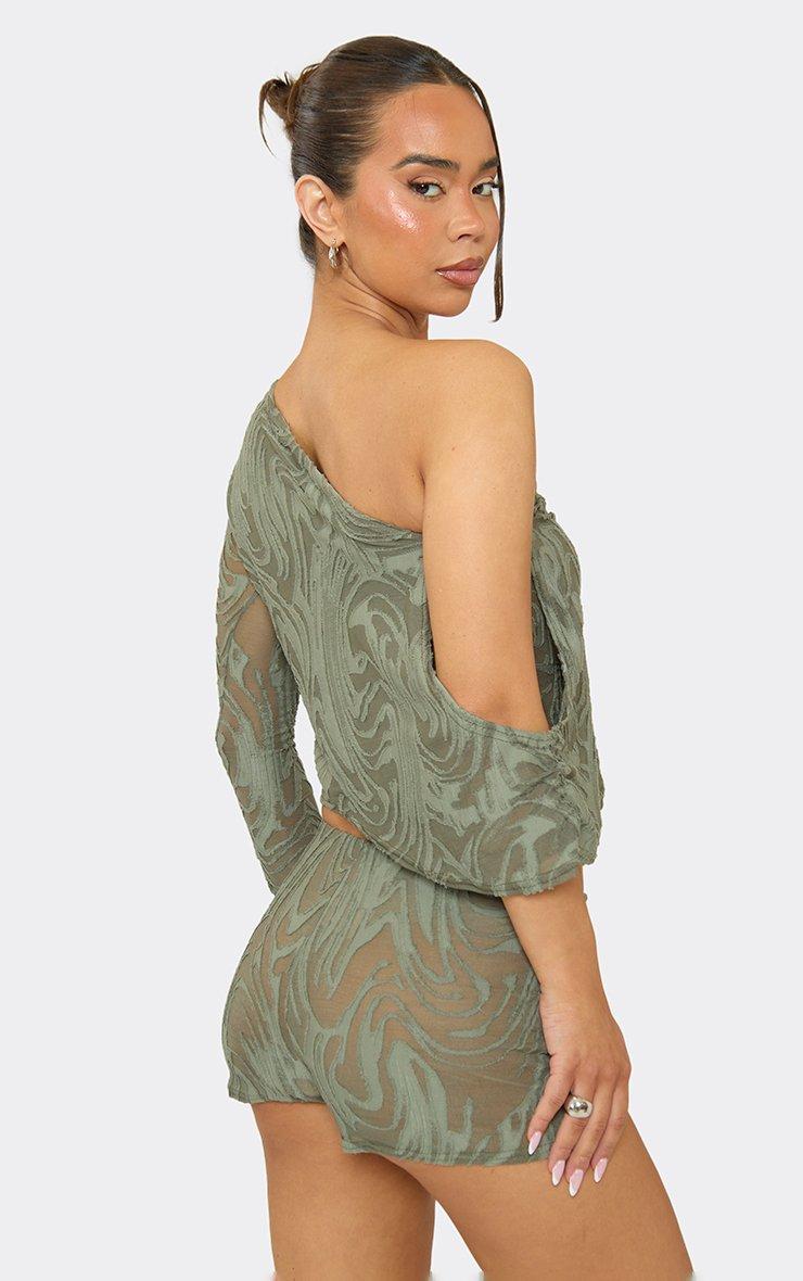 One Shoulder Asymmetric Blouson Detail Top In Olive Green Slinky