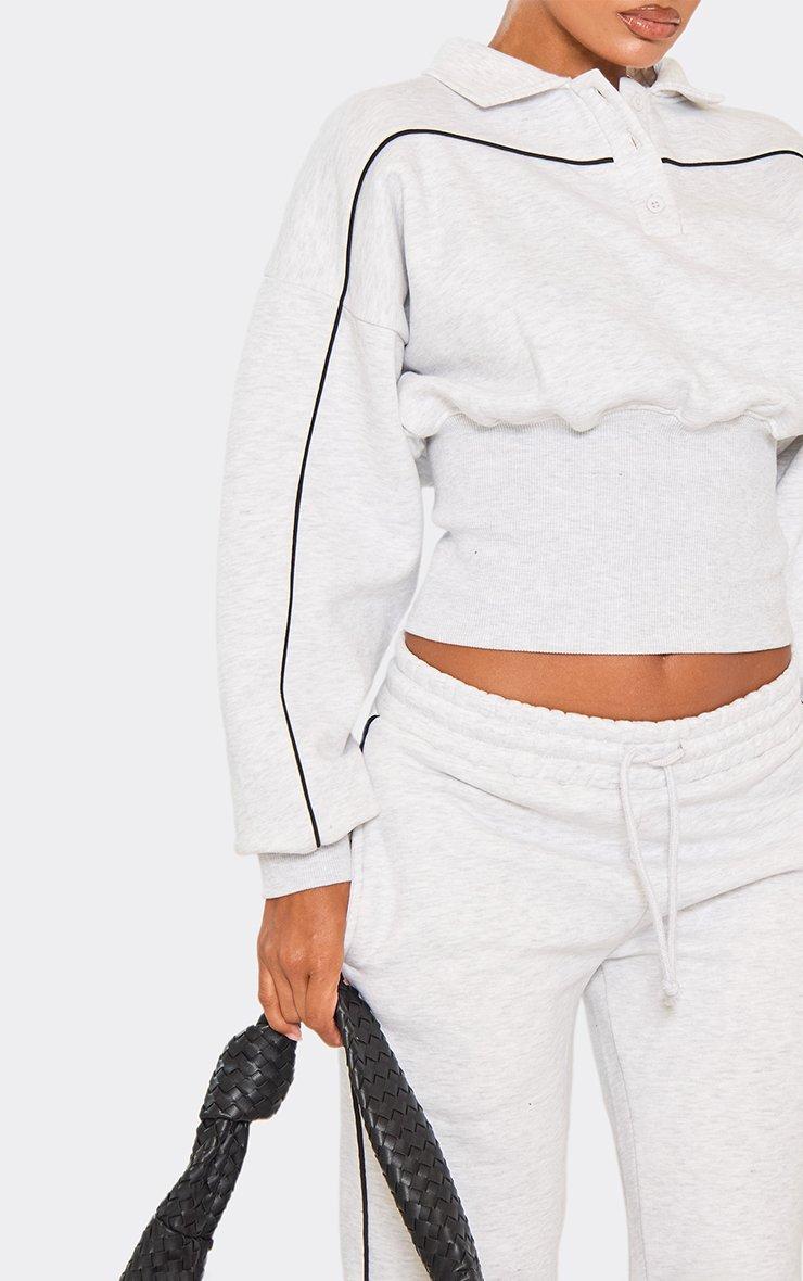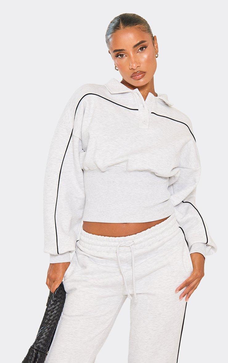 Contrast Piping Detail Button Front Cinched Waist Collared Sweatshirt In Light Grey Marl