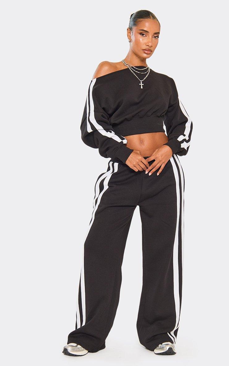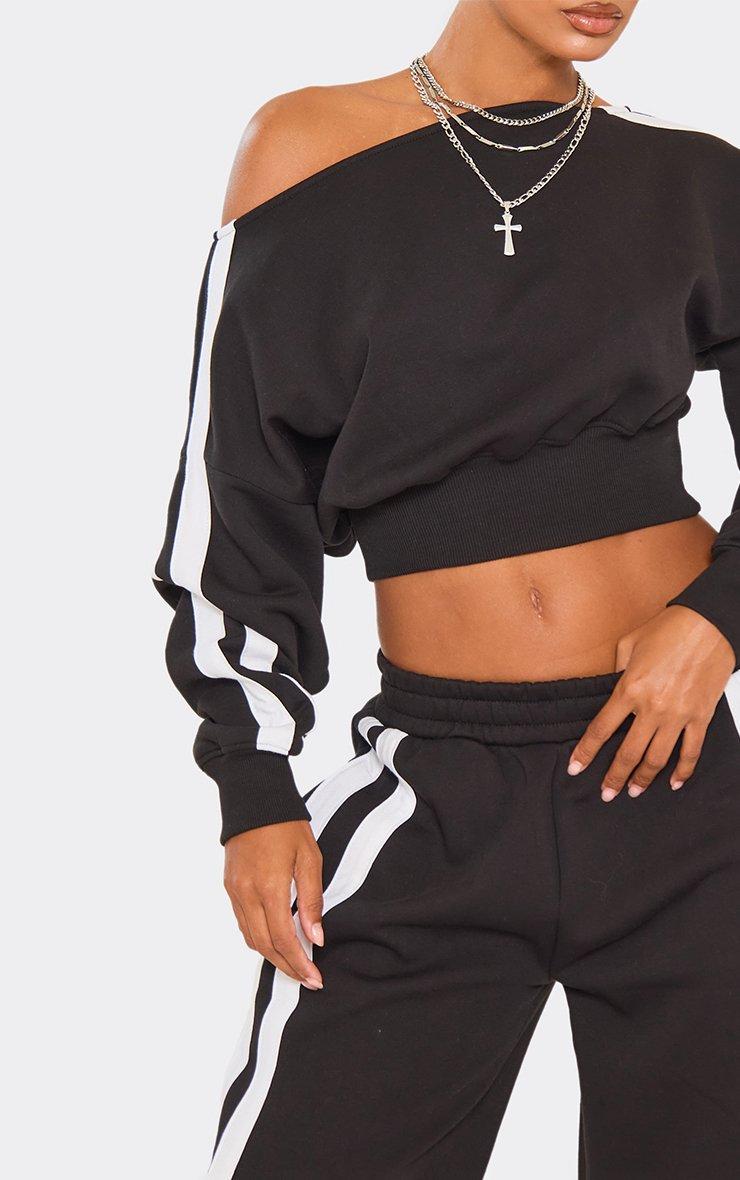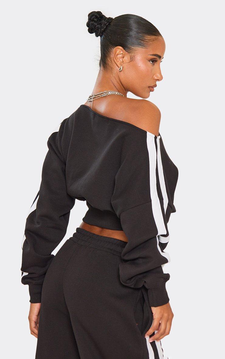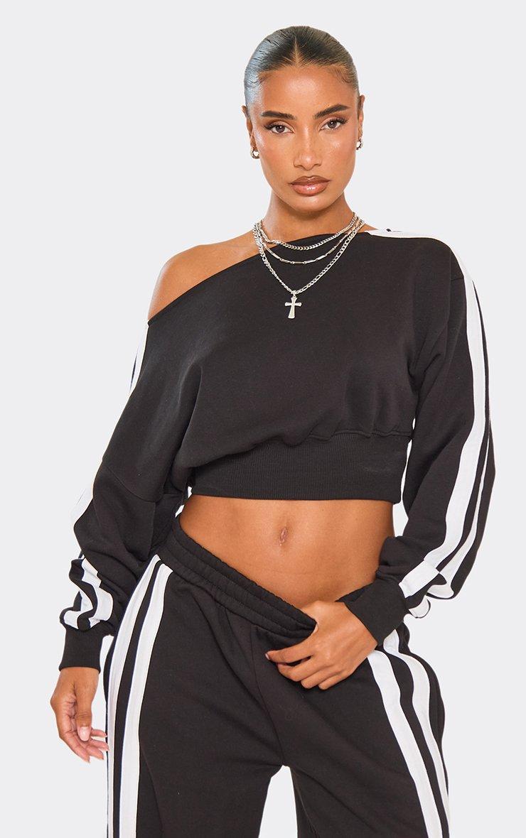 Off The Shoulder Long Sleeve Side Stripe Detail Sweatshirt In Black