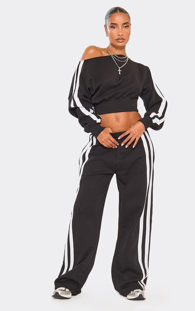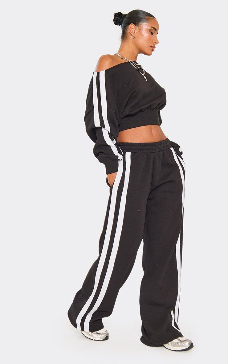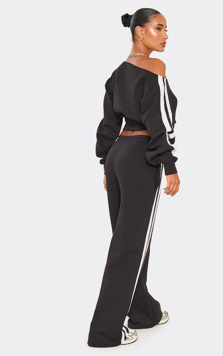 High Waist Contrast Stripe Detail Wide Leg Joggers In Black