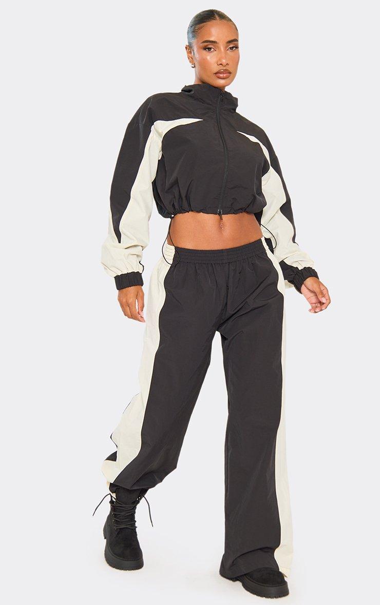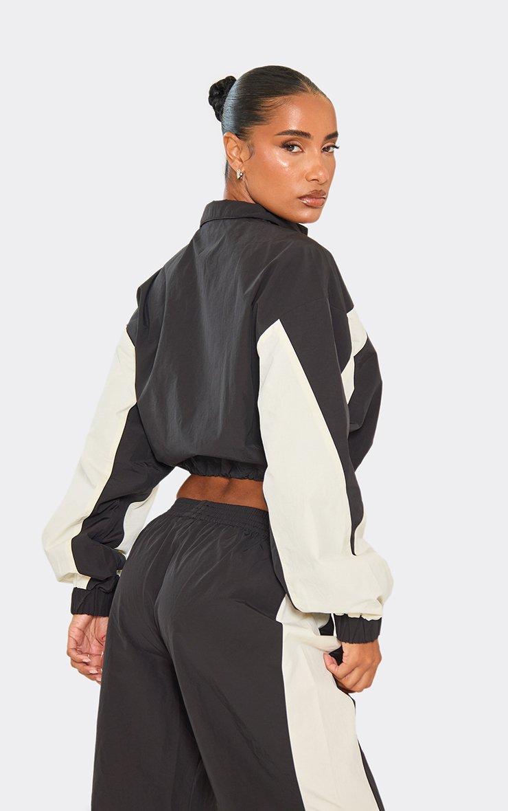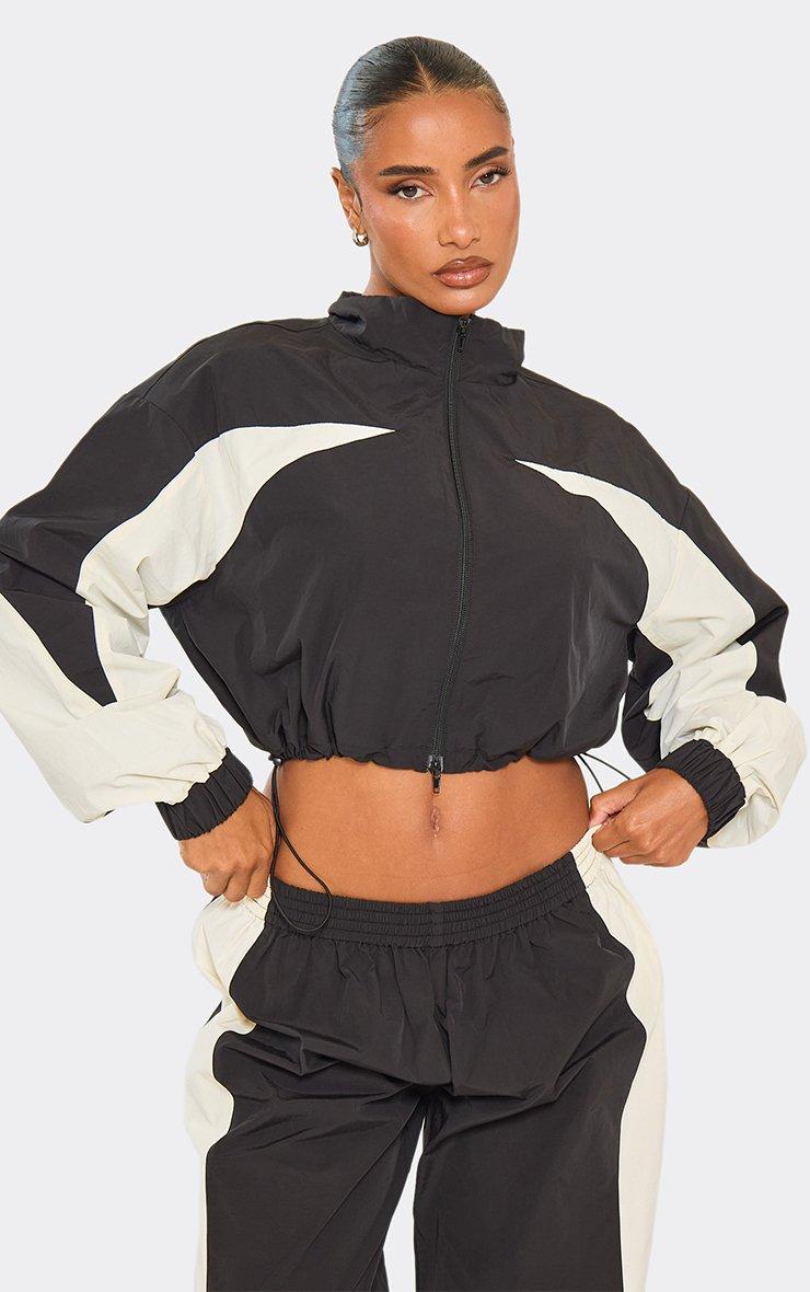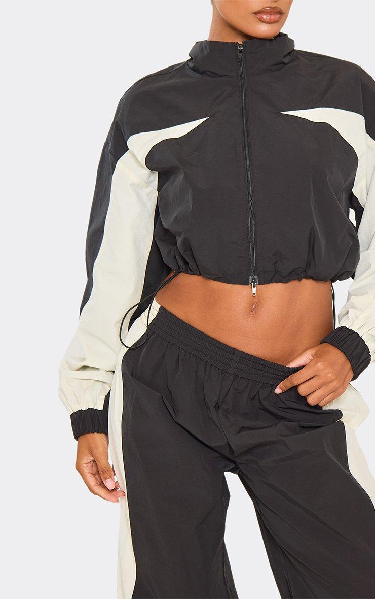 Long Sleeve Contrast Panel Detail Toggle Hem Zip Up Cropped Jacket In Black Shell