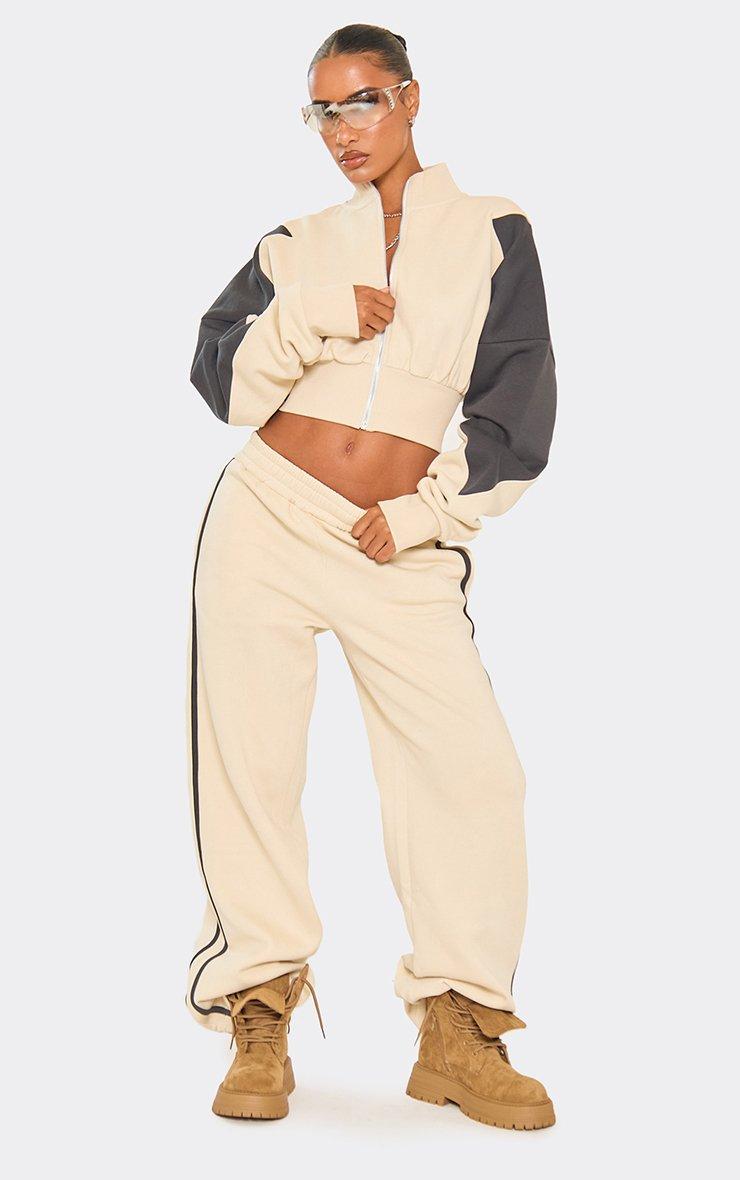 Contrast Panel Wide Leg Detail Joggers In Stone
