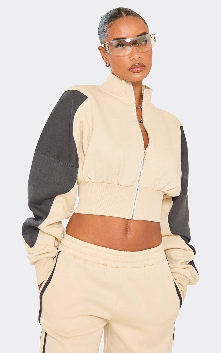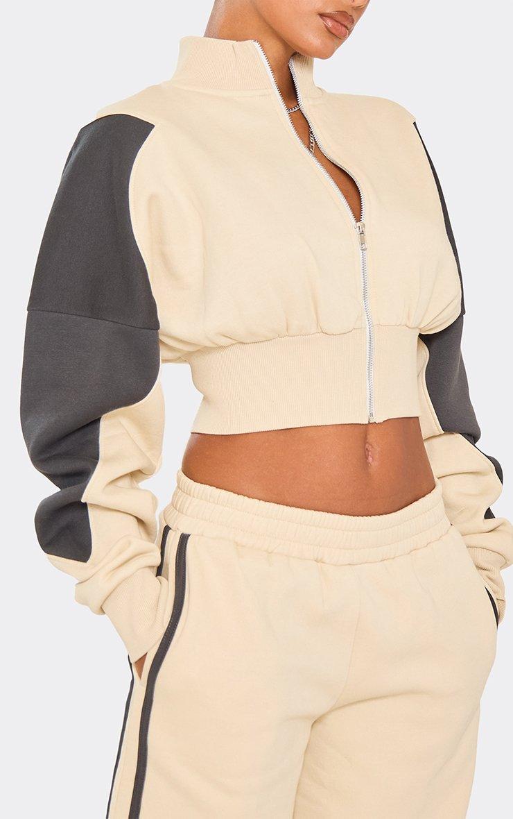 contrast panel cinched waist zip up detail sweatshirt in stone