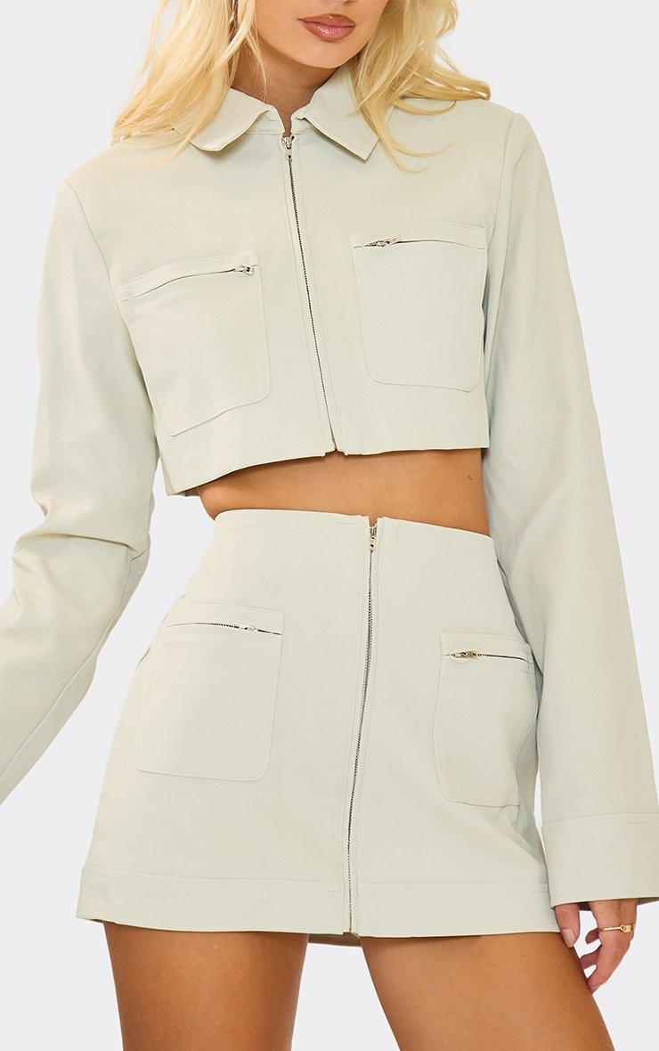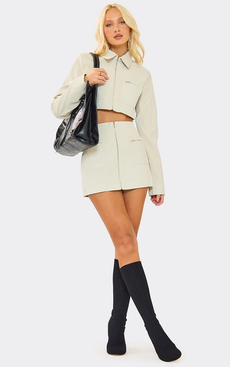 Collar Neck Zip Through Cargo Pocket Cropped Jacket In Stone Faux Leather