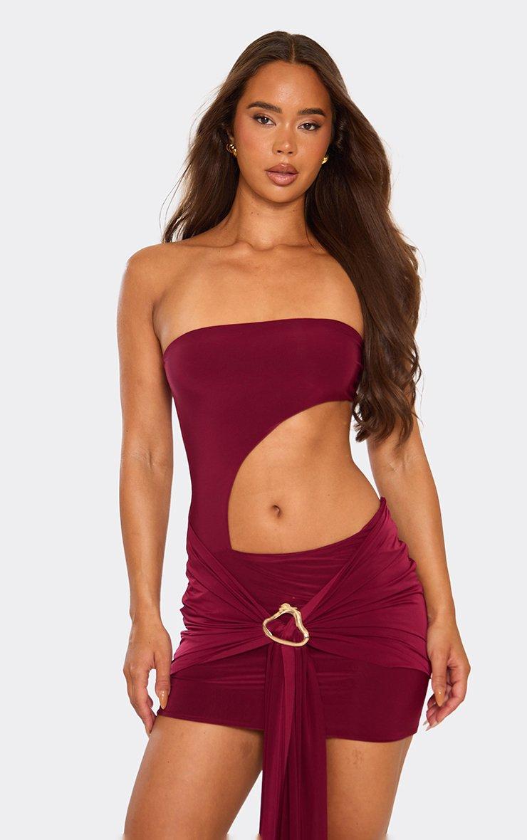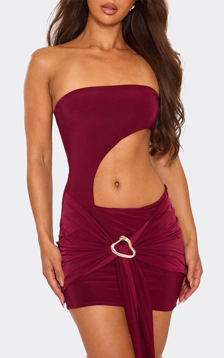 Bandeau Side Cut Out Drape Detail Mini Dress In Burgundy Red