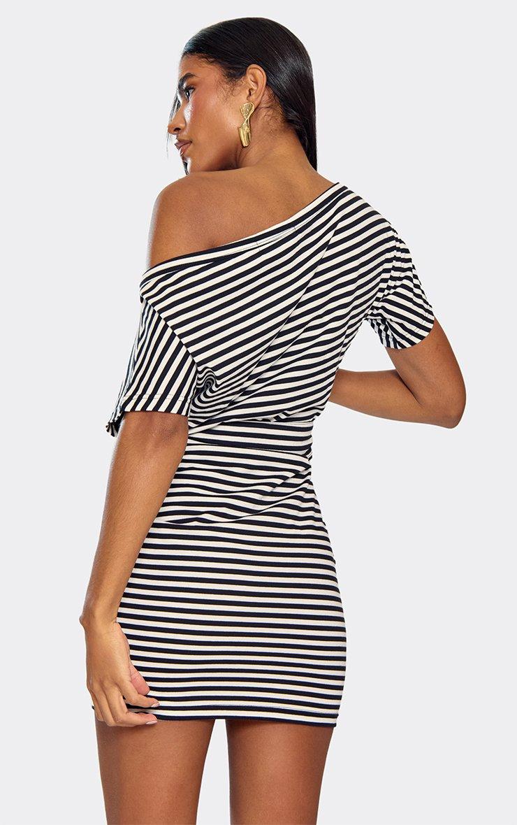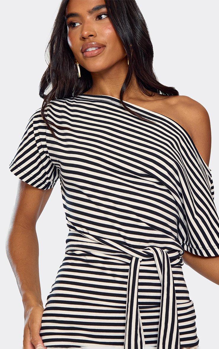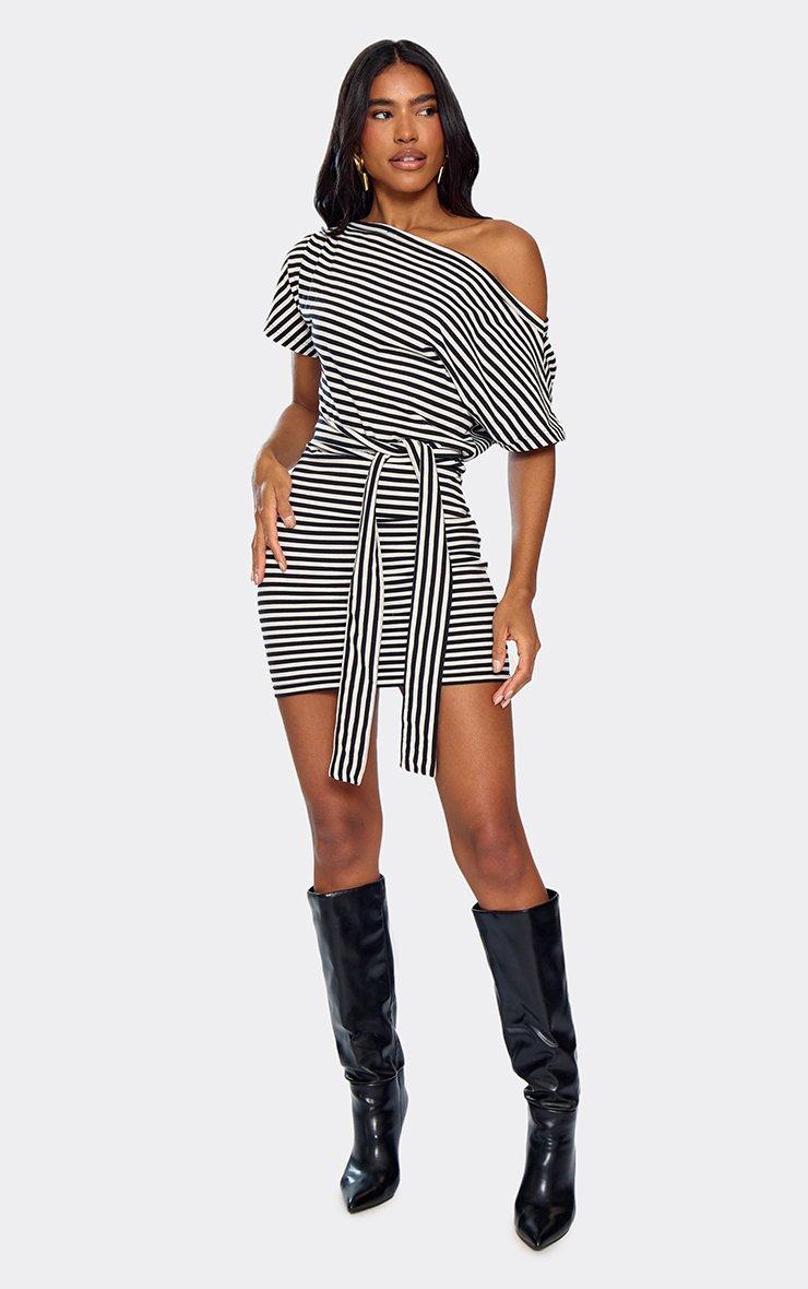 Off The Shoulder Belt Detail Mini Dress In Black Stripe