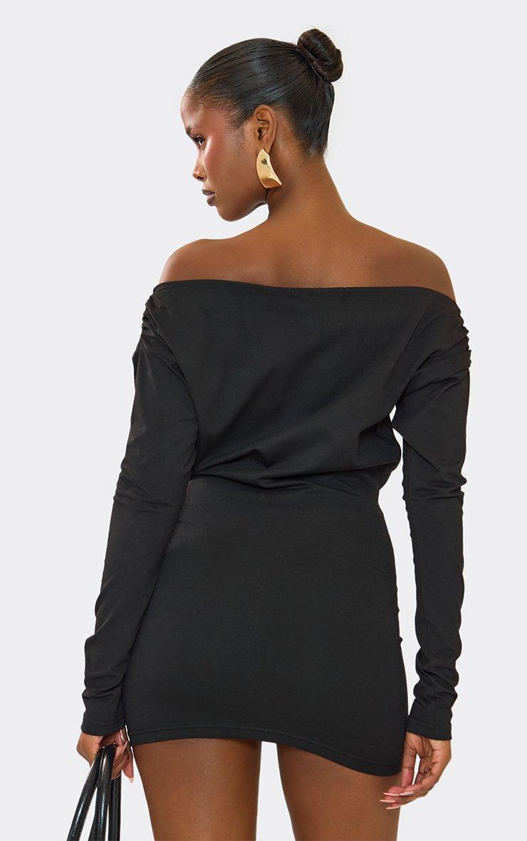 off the shoulder long sleeve ruched detail bodycon mini dress in black