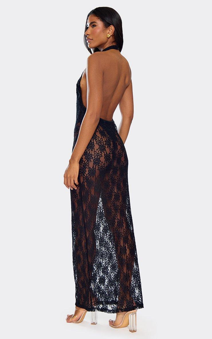 halterneck bodysuit lining scooped back detail maxi dress in black floral lace