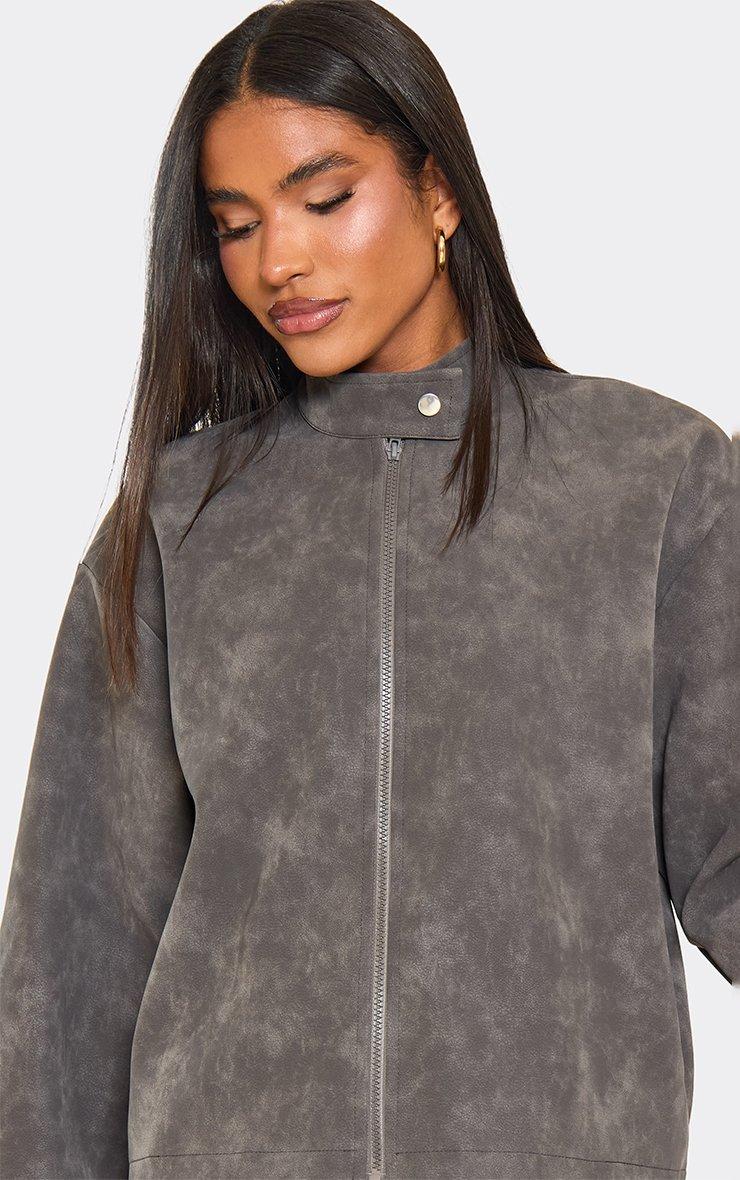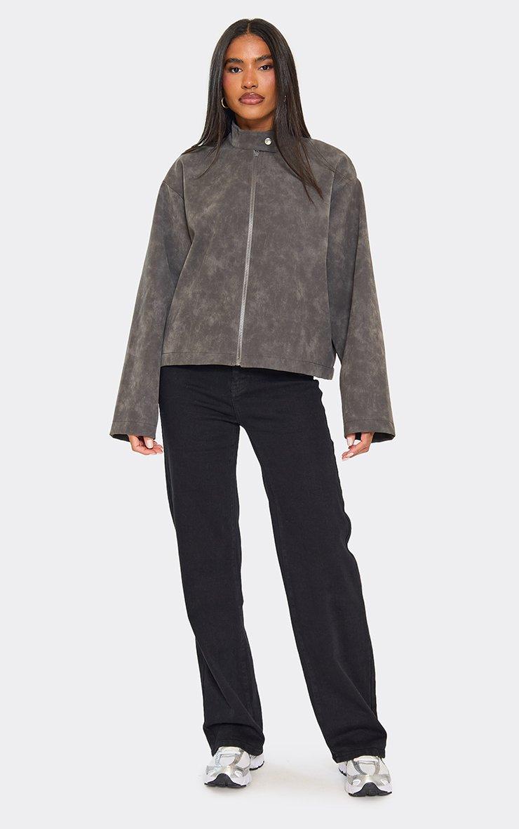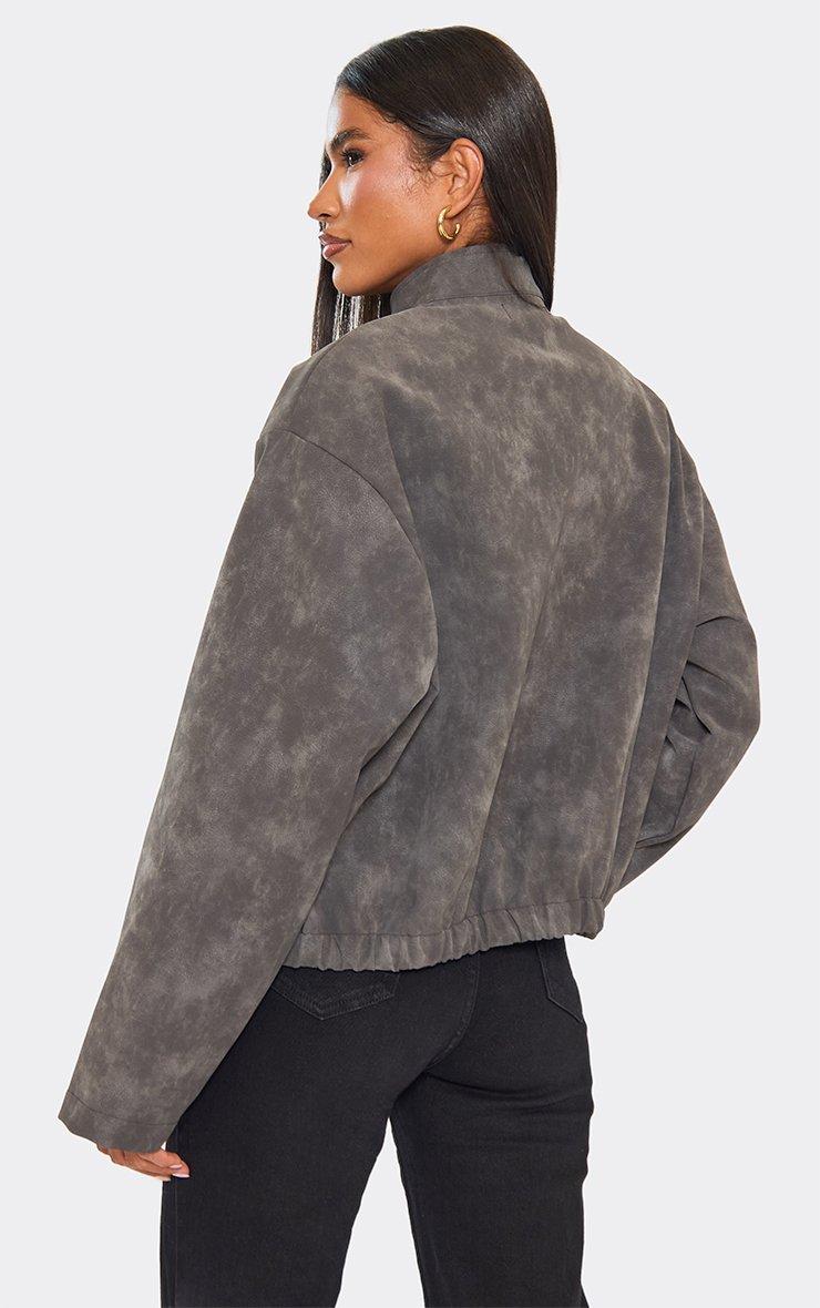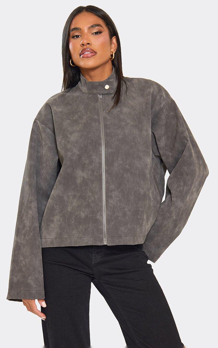 High Neck Boxy Washed Jacket In Grey Faux Leather