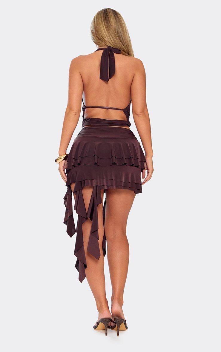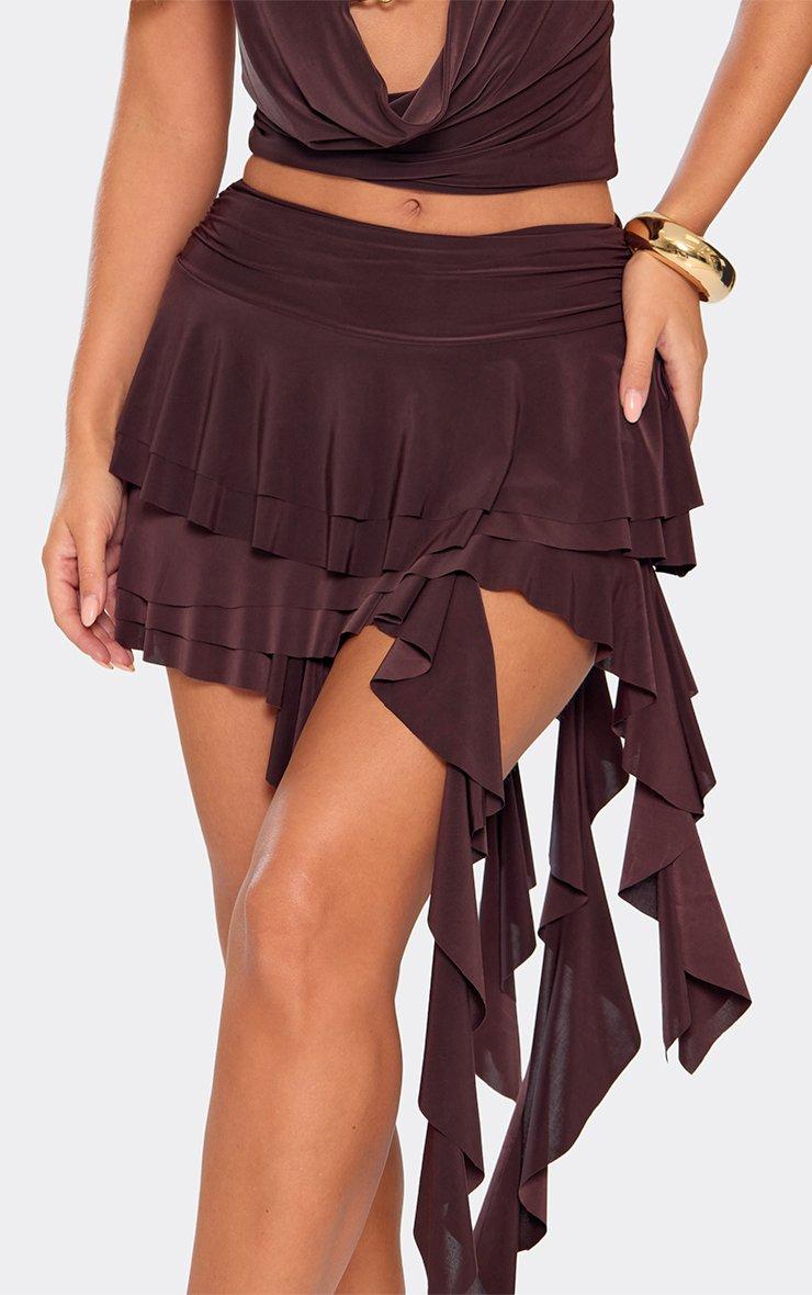 Mid Waist Drape Frill Tiered Mini Skirt In Chocolate Brown