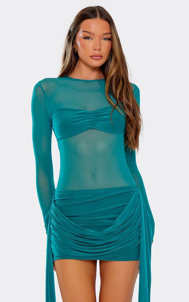 Long Sleeve Slinky Bust Detail Bodysuit In Teal Mesh