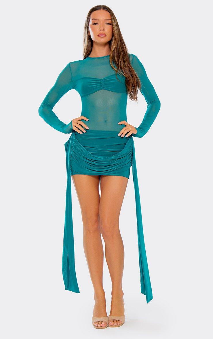 Mid Rise Rope Detail Ruched Mini Skirt In Green Texture