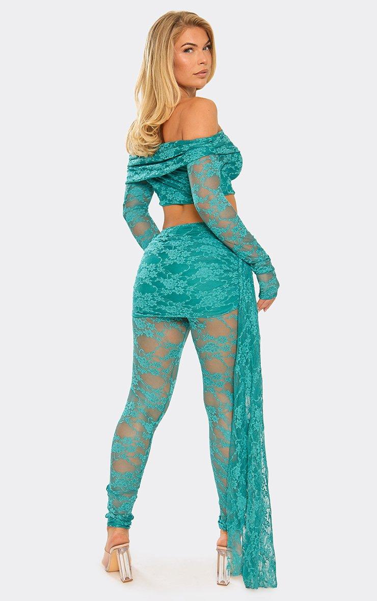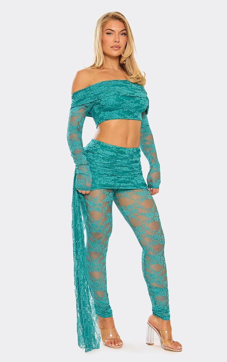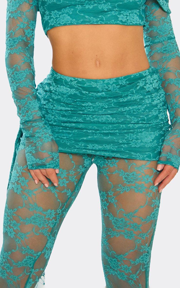 Low Rise Slinky Fold Over Waistband Flared Trousers In Khaki Green Lace