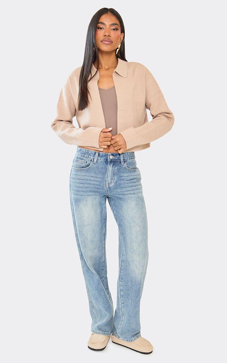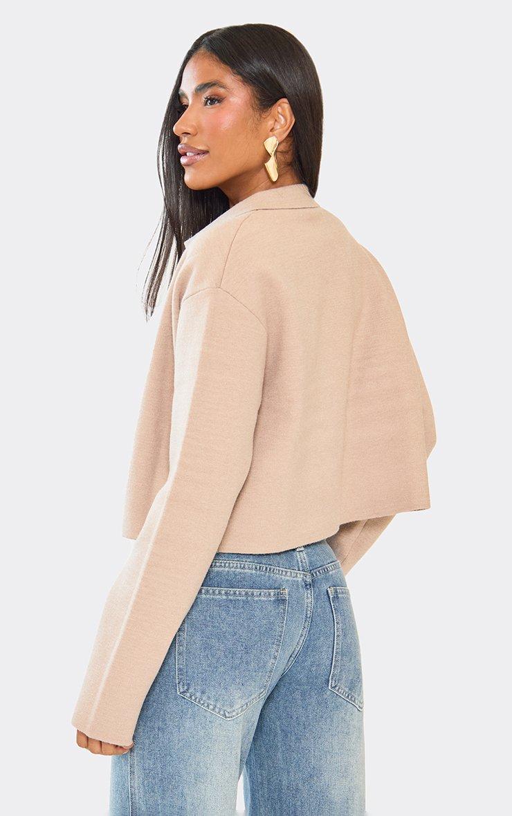 Long Sleeve Collared Detail Boxy Jacket In Beige Compact Knit