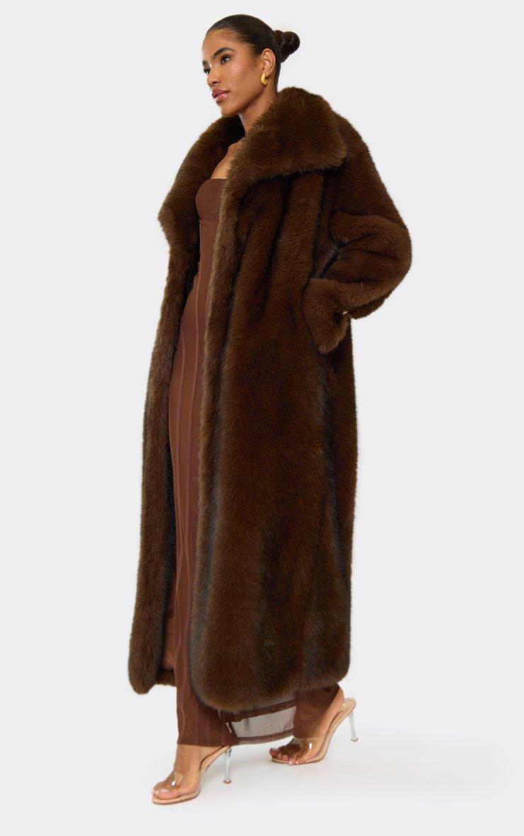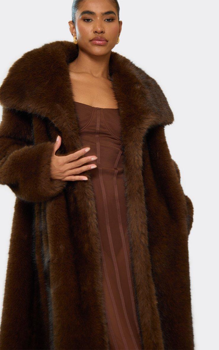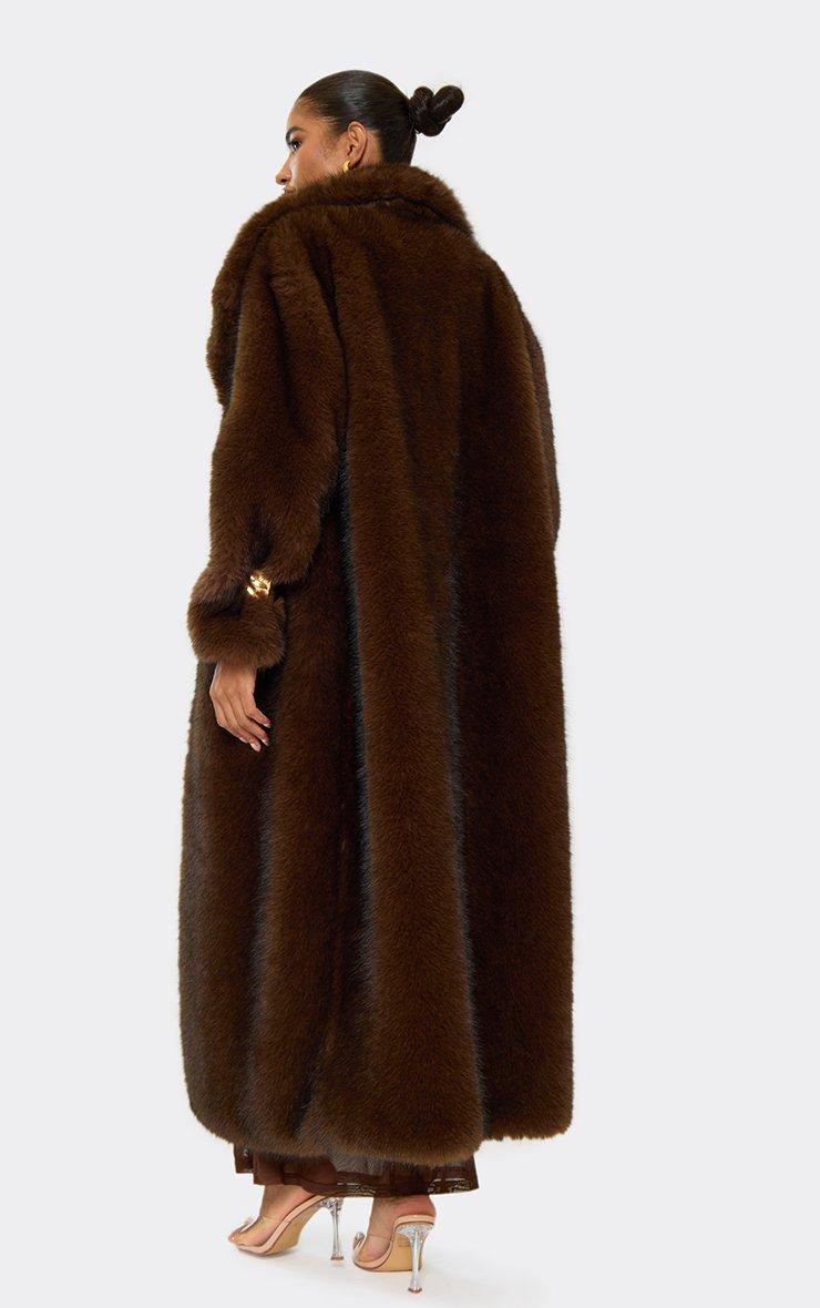 Oversized Collar Detail Maxi Coat In Chocolate Brown Faux Fur