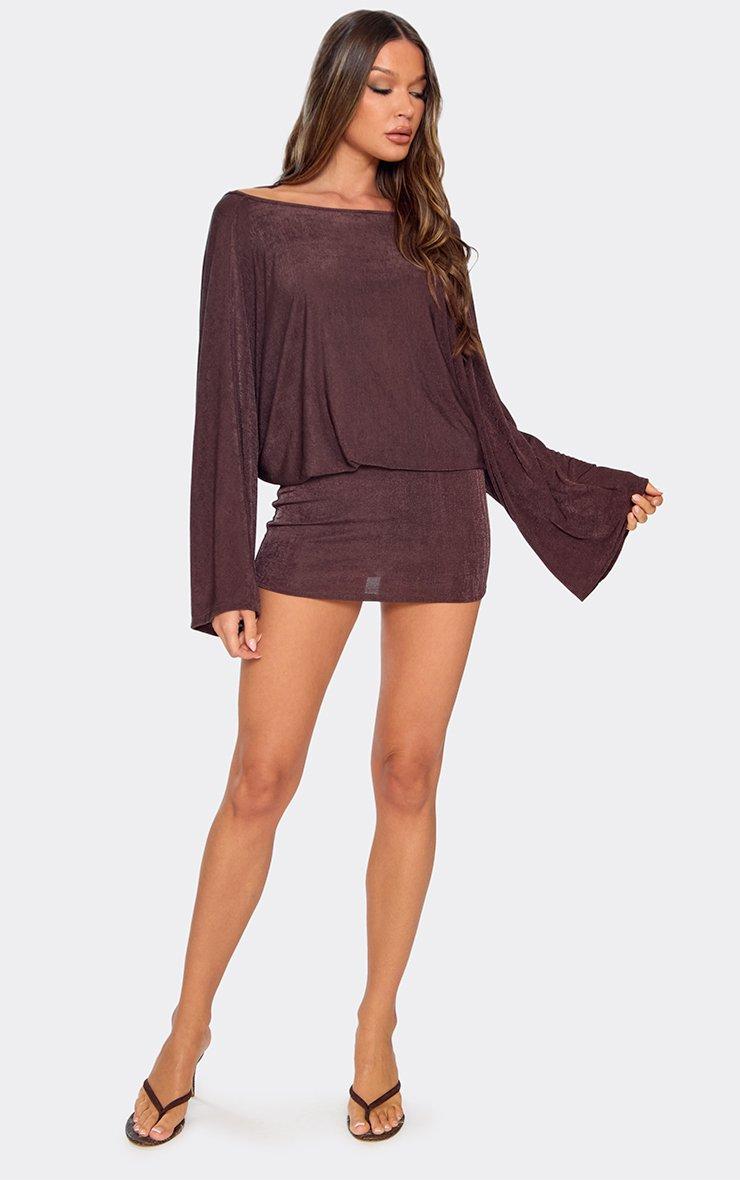 Extreme Cowl Flared Sleeve Mini Dress In Brown Slinky