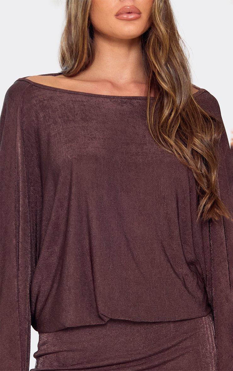 Long Sleeve Off The Shoulder Slouchy Ruched Mini Dress In Brown