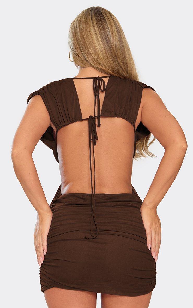 Cross Over Ruched Detail Mini Dress In Chocolate Brown Mesh