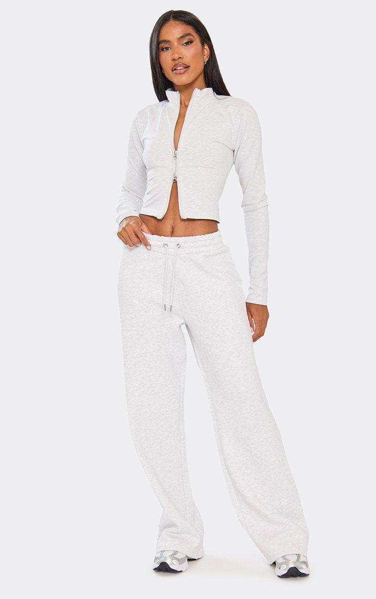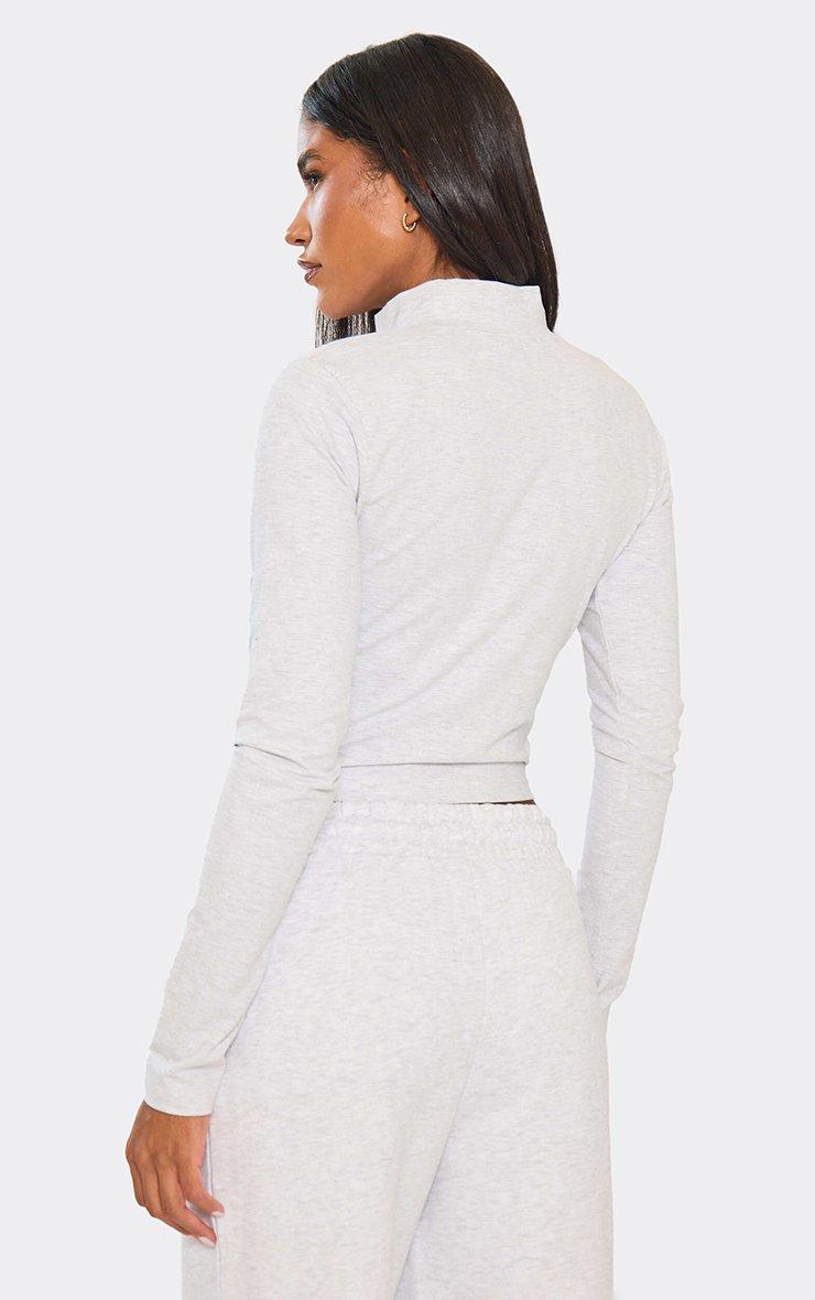 Long Sleeve Collared Popper Detail Top In Light Grey Marl