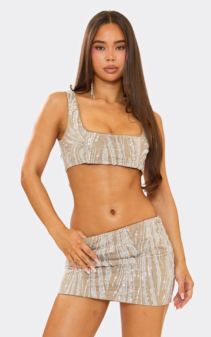 Square Neck Slinky Vest Top And Sequin Mini Skirt Co-Ord Set In Silver