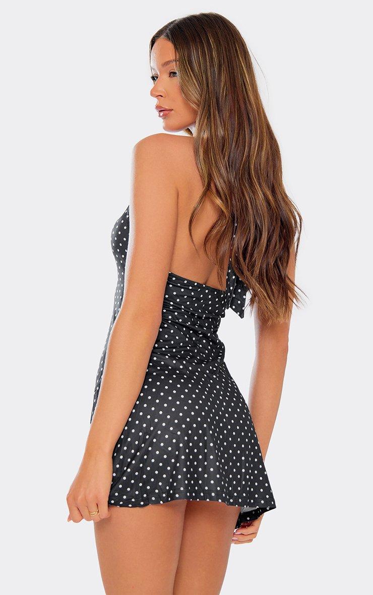 High Neck Open Back Detail Skater Mini Dress In Black Polka Dot