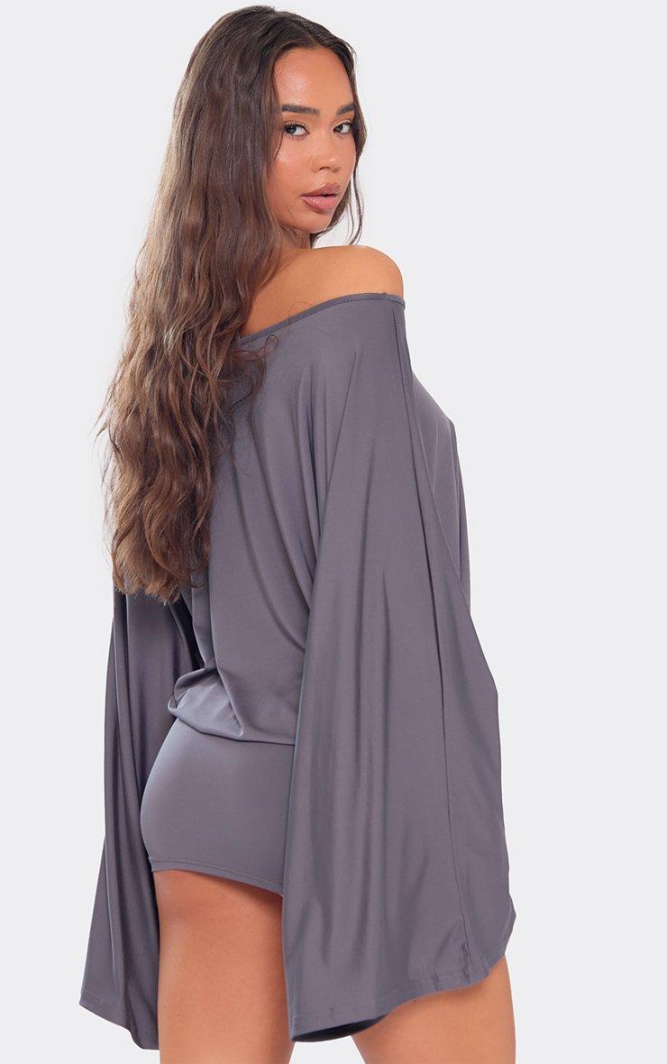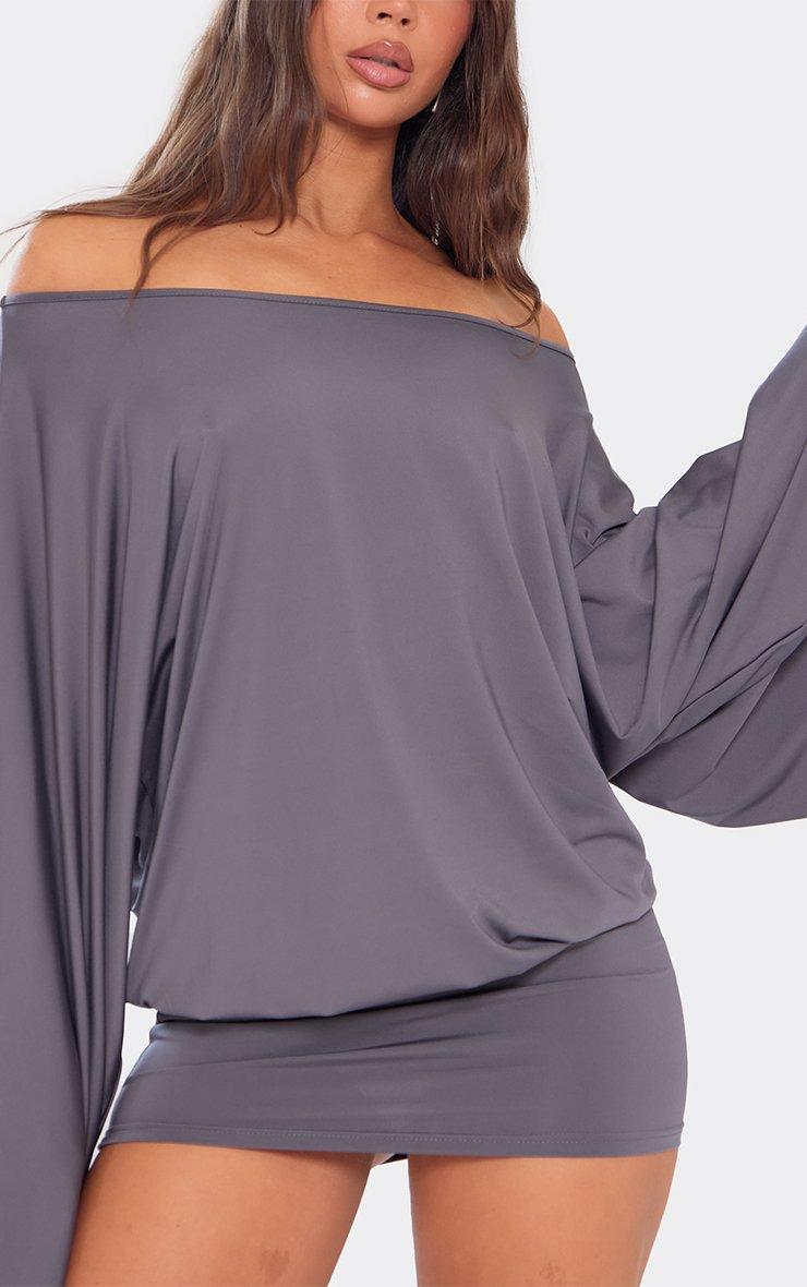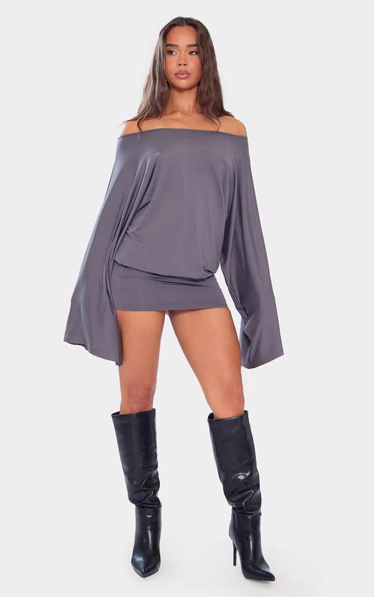 bardot wide sleeve blouson detail mini dress in charcoal grey